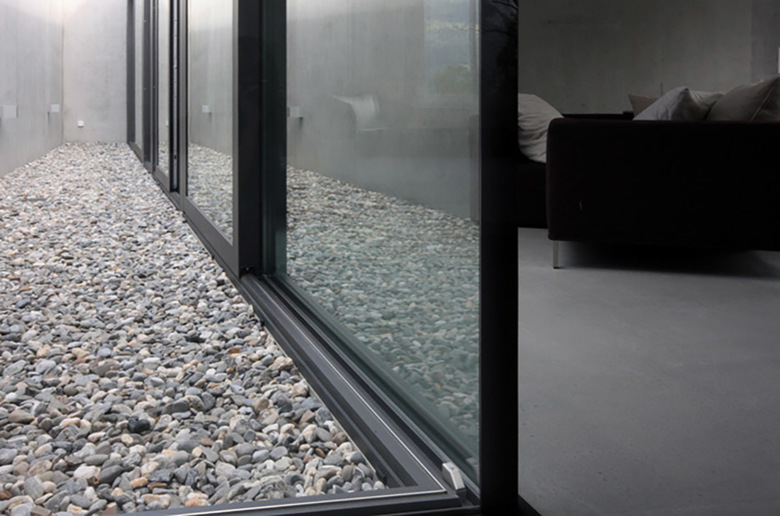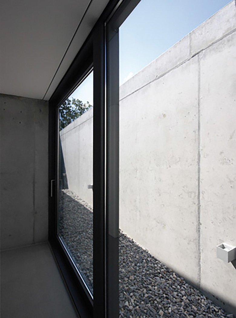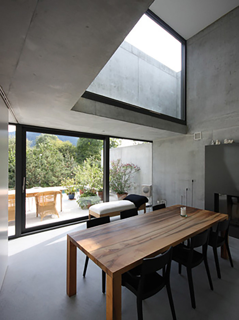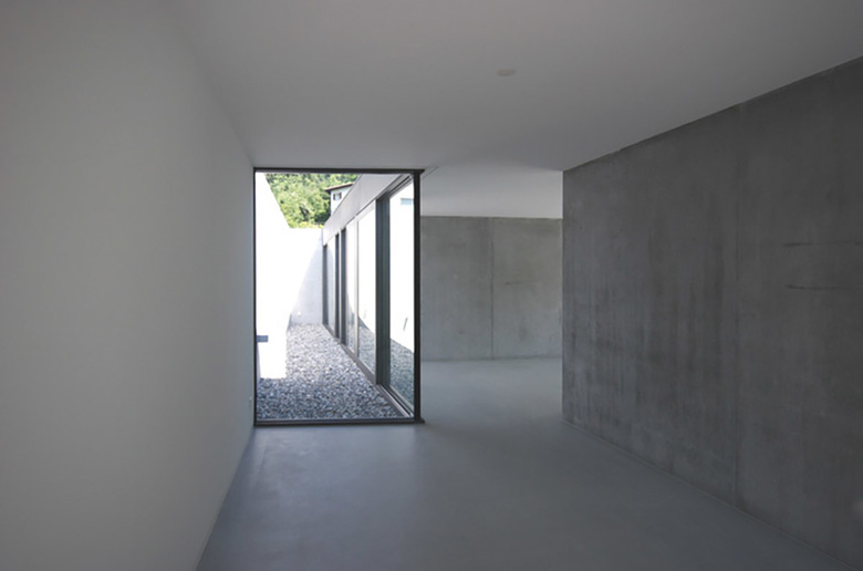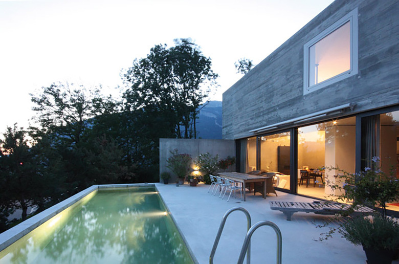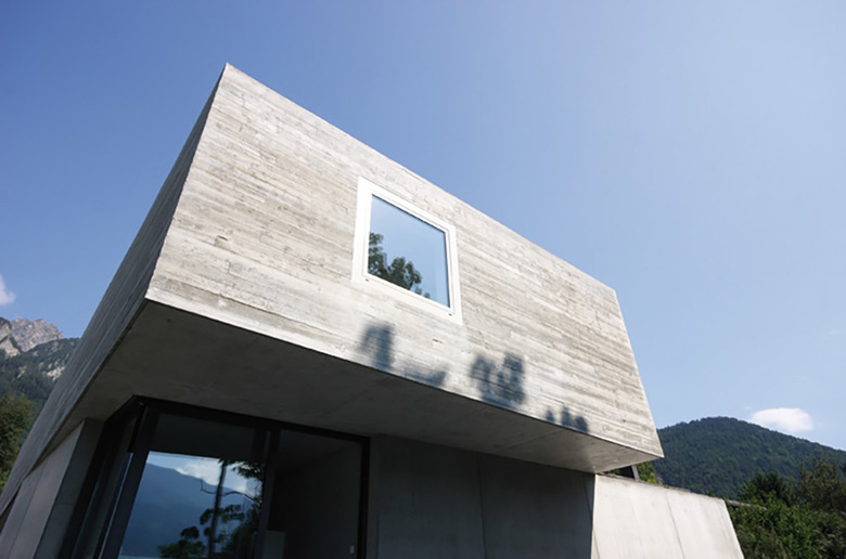 Trotz Eingrabung des Hanggeschosses in den Berg bleibt dessen Dimension von allen Seiten des Gebäudes ablesbar. Es bildet zusammen mit dem Pool eine Plattform für den Wohnbereich des darüber liegenden Erdgeschosses, welches, als Raumklammer konzipiert, den privaten vom öffentlichen Raum abgrenzt. Einblicke von der Strasse her werden konsequent vermieden. Die mehrfach geknickte Sichtbetonwandscheibe stellt nicht nur den Raumabschluss des Erdgeschosses dar, sondern verbindet darüb