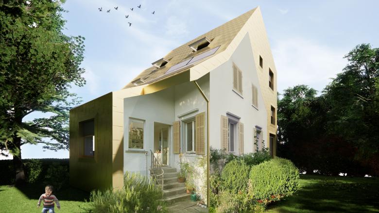 Das bestehende Einfamilienhaus von 1924 hat für die private Bauherrschaft einen emotionalen Wert und soll durch einen Um- und Anbau ein modernes Wohnen ermöglichen. Durch den bewussten Entscheid des Erhalts und Ergänzung der bestehenden Bausubstanz und gegen einen Ersatzneubau ordnet sich das Neubauvorhaben in die Körnigkeit und Erscheinung des Quartiers ein. Der Gebäudecharakter wird modernisiert, jedoch im Sinne eines architektonischen Weiterdenkens der quartiertypischen, ursprünglichen Bausubstanz. Der Anbau schmiegt sich an das bestehende Gebäude an und verschmilzt mit dem Bestand zu einem neuen Ganzen. Der Anbau wird in Holzbauweise erstellt und mit einer bronzierten, geschindelten Metallfassade verkleidet.