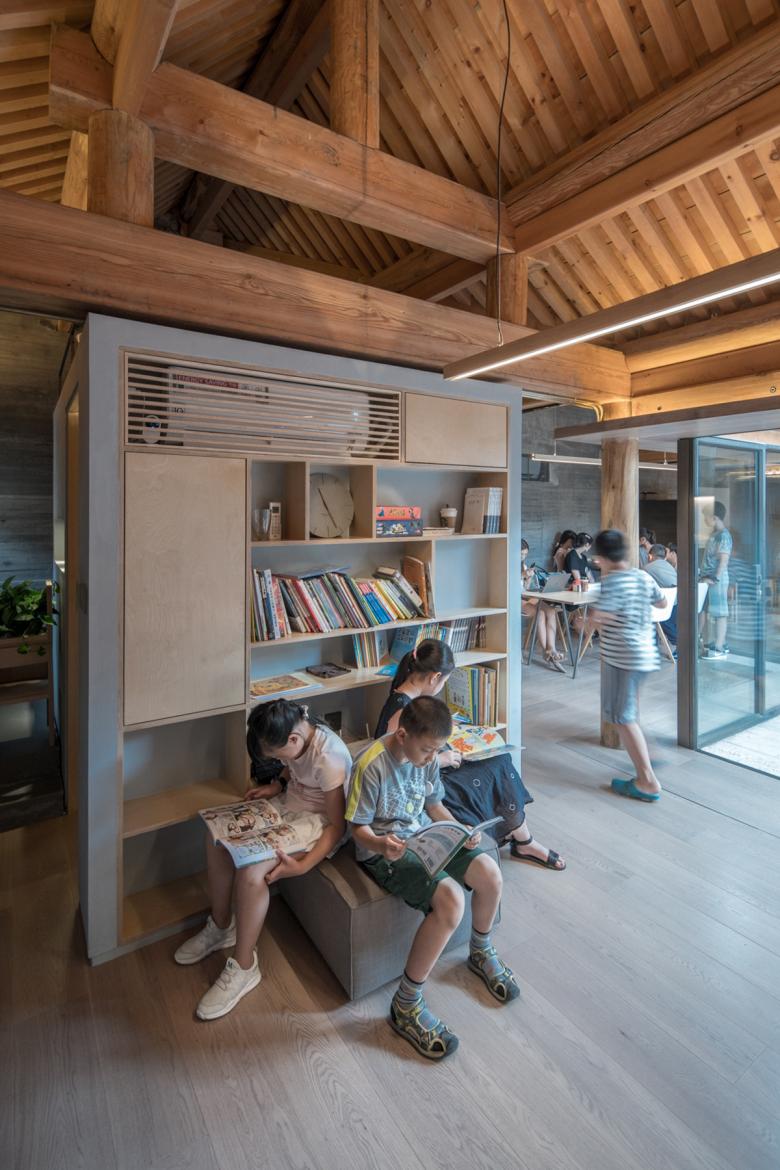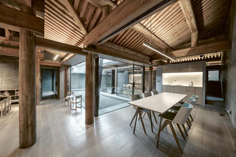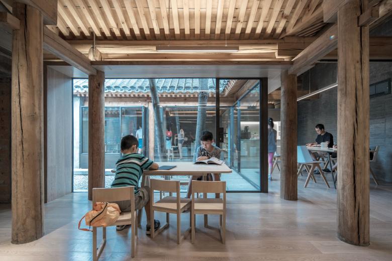 This converted, U-shaped courtyard house is located at the end of a cul-de-sac and surrounds a narrow courtyard. The architects opened up the façades towards the courtyard on three sides with large-scale glazing. The interior and exterior spaces are thus interconnected, with the courtyard with two trees extending the area. In the interior, the combination of concrete surfaces and natural wood constructions gives rise to a calm aesthetic that emphasizes the traditional elements of the historical structures. The rooms are used by a charitable educational organization that offers a daily program for residents of the neighbourhood.