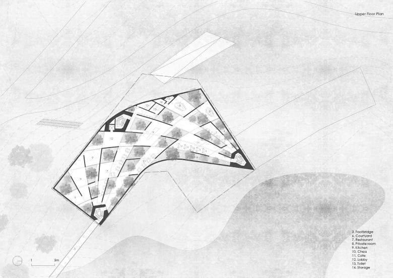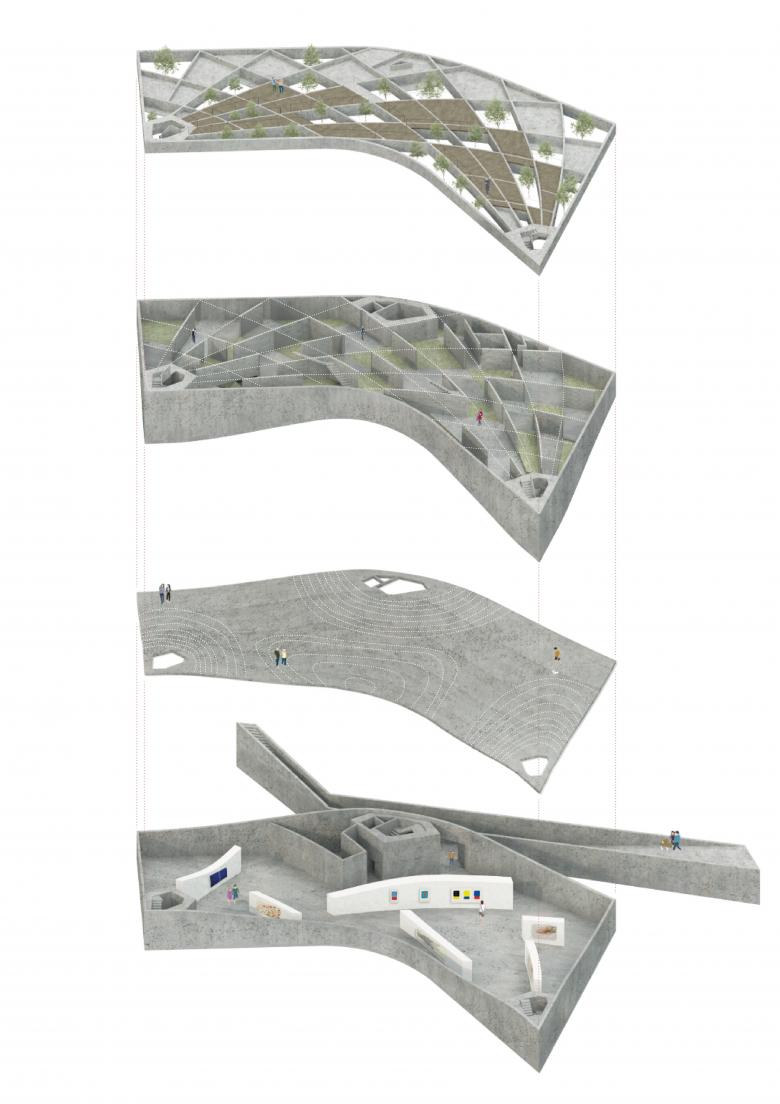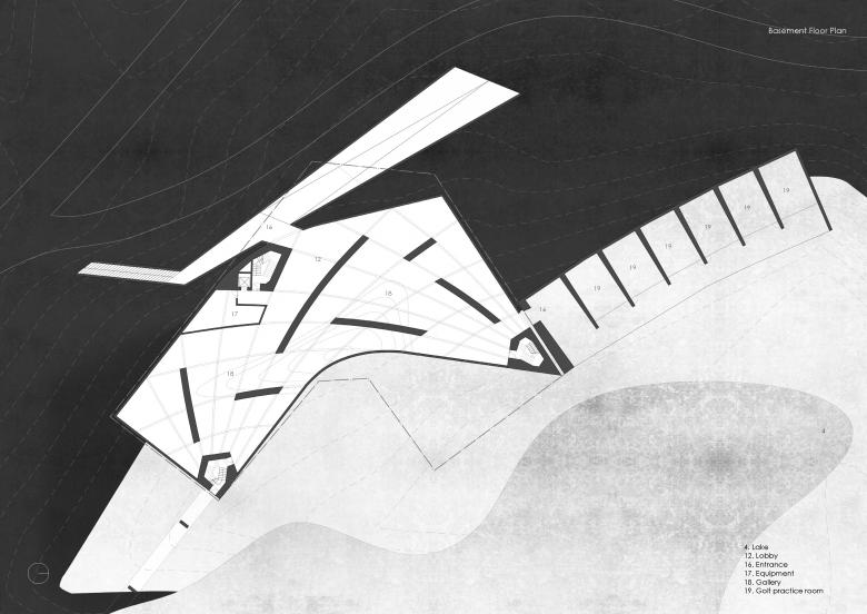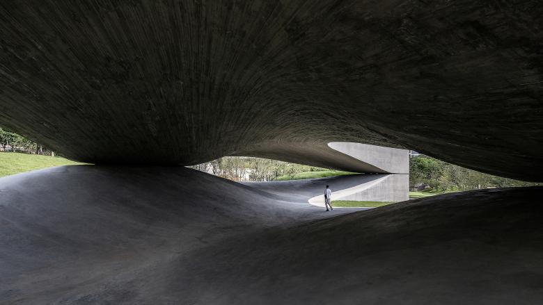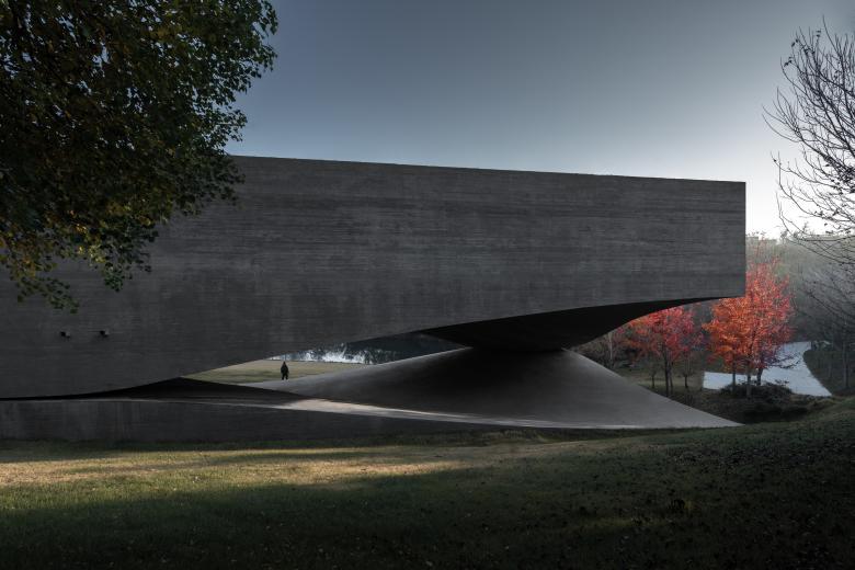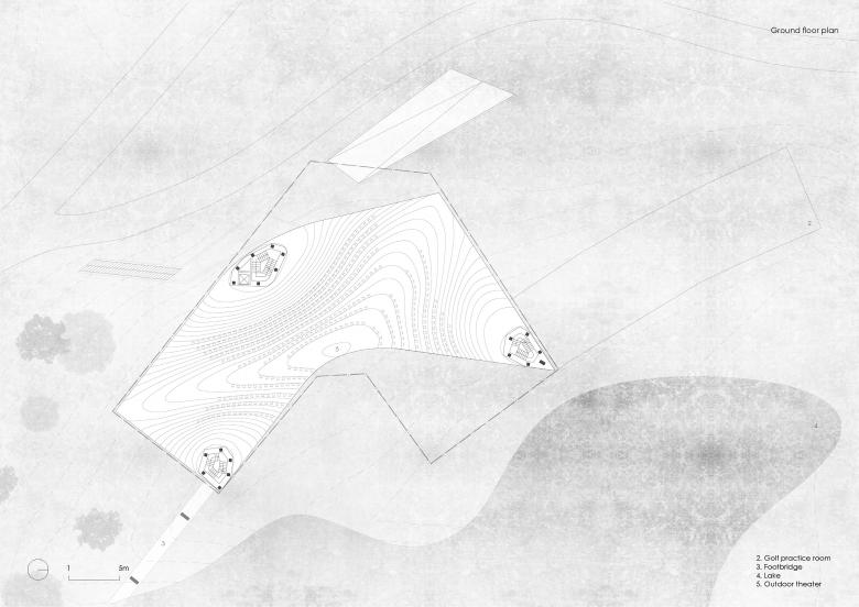 The ensemble is embedded in a hilly landscape with a small lake and makes reference to it with its curved form. The construction system consists of a curved mesh of concrete beams that support the upper part of the building on three corners. The upper story is closed to the outside and forms a labyrinthine interior landscape along with trapezoidal courtyards and spaces. The accessible roof provides a view of the landscape.