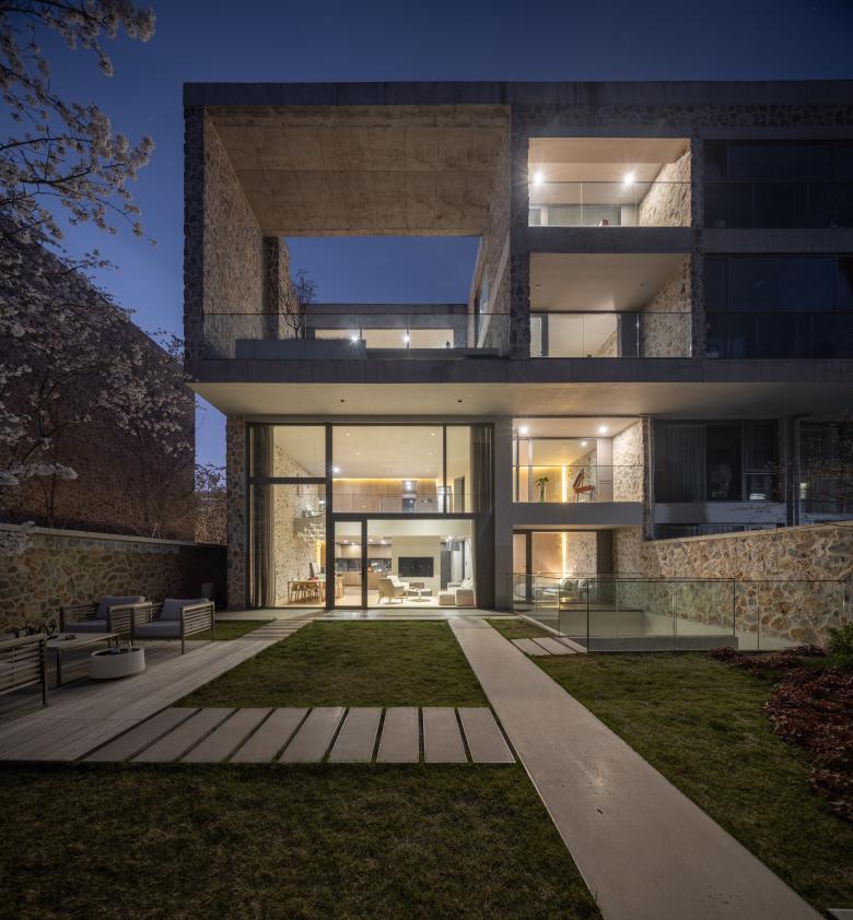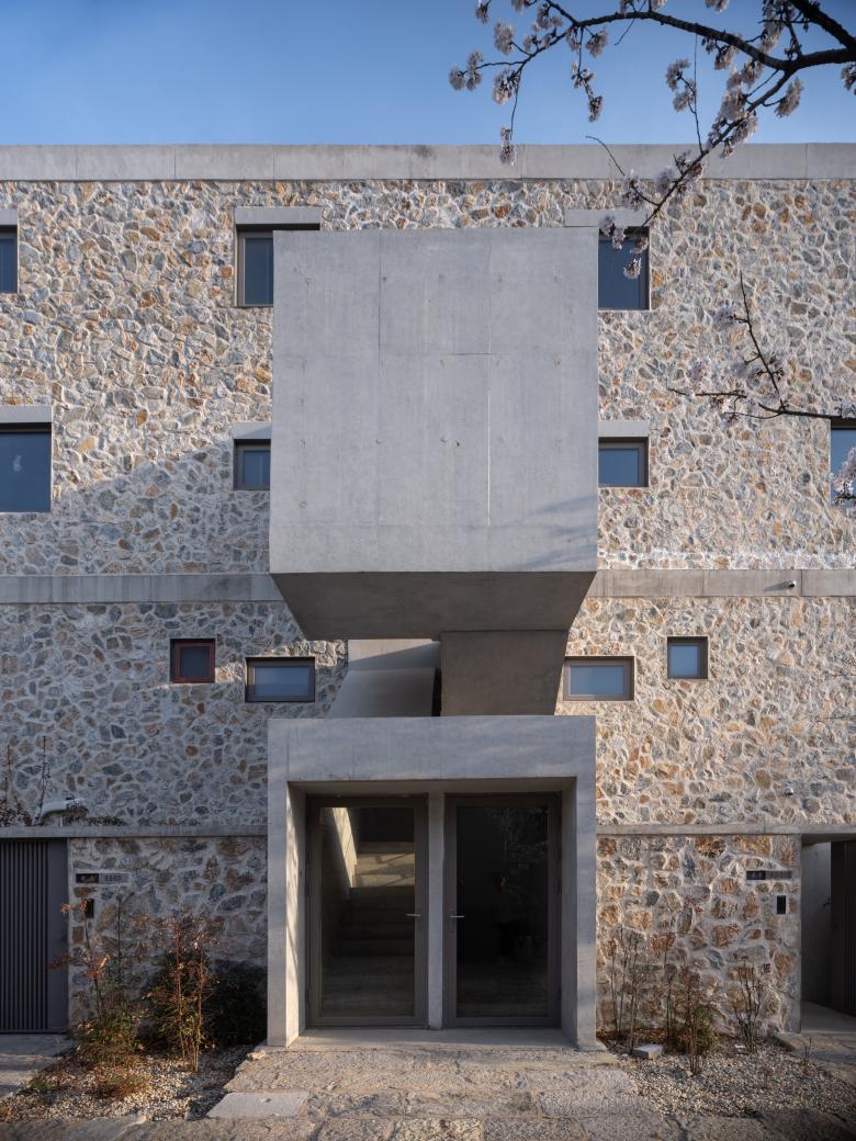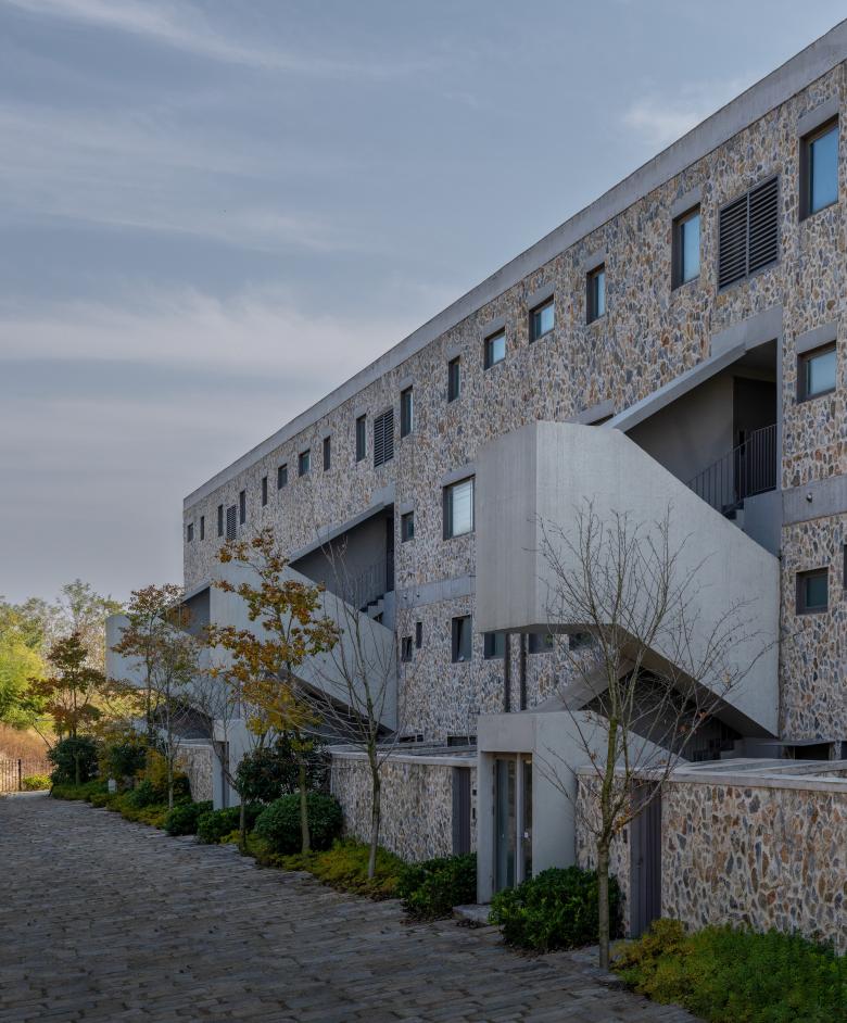 The transition between indoor spaces and the outdoor courtyards is three-dimensional, with a continuous stone façade that seamlessly blends interior and exterior. This design allows the landscape to naturally penetrate the space, creating a dynamic interaction between the built environment and the surrounding landscape. As a result, the boundaries between neighboring units become blurred, fostering a stronger sense of community and enhancing the atmosphere.