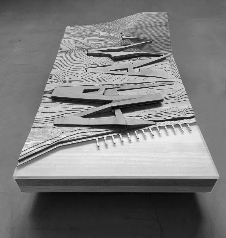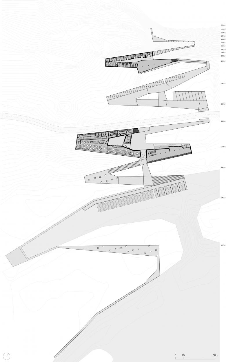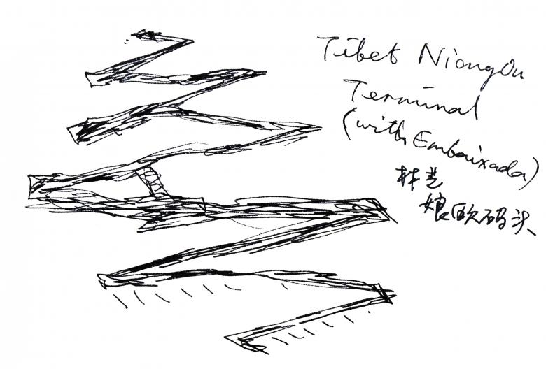 The Niangou Terminal is located at the confluence of the Niyang River and Yarlung River, a still intact place of overwhelming beauty. The landing dock required installations for modernizing and expanding the existing capacities that would lead to a substantial increase in the human impact on the landscape. The new building is based upon the idea that it is vital to establish a contextual dialogue at the scale of the landscape. The new space requirements are organized under a zig-zag downhill promenade. The promenade follows the natural slope down for thirty metres until reaching the lowest level river mark. The form structures and organizes all functions and gives them a hierarchic unity, which defines all inter-spatial relations. This way each space can find its own relationship with the landscape and mediate the connection with the human scale. The design for this project developed as a collaboration with the Lisbon-based architects Embaixada.