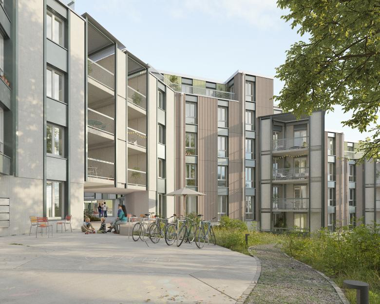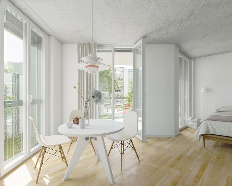 Die Struktur der Wohnungsgrundrisse ist einfach und kostengünstig, der sehr vielfältige Wohnungsmix ist Basis für ein breites Spektrum an unterschiedlichen Lebens- und Familienformen welche in der neuen Siedlung ihr Zuhause finden sollen.