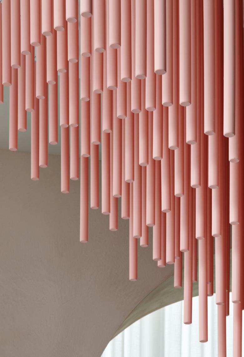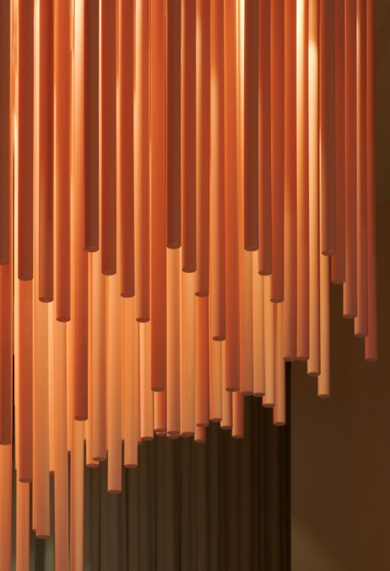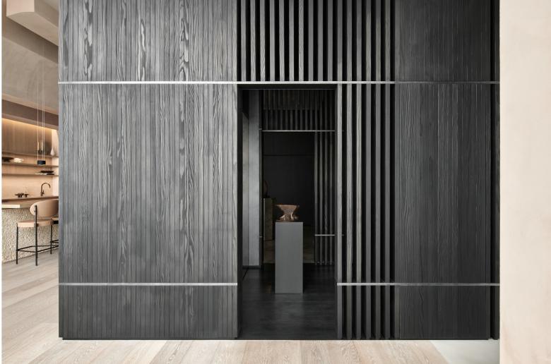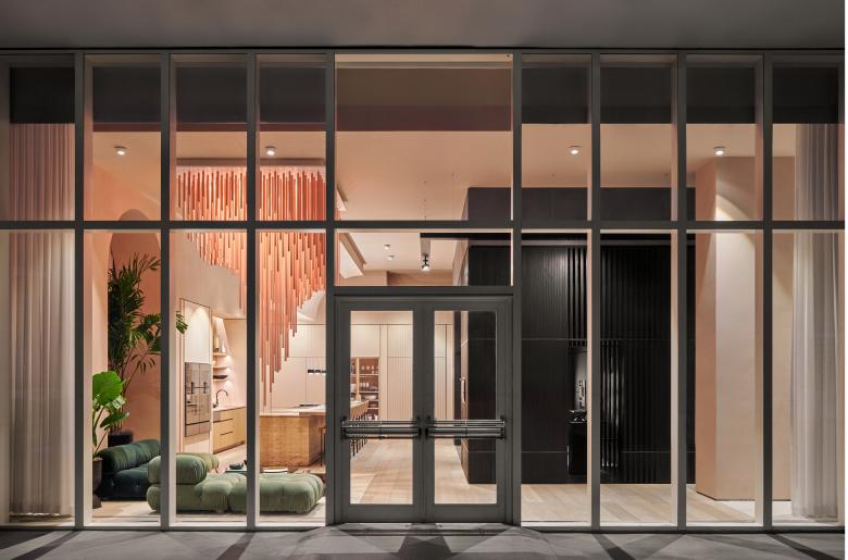 Capturing the feeling of a sunset at the beach, this showroom overlooking the bay mimics Miami with sandy hues and a split travertine island, resembling coral stone shaped by the ocean. Fragments of arches remind of Miami’s art deco architecture. A custom chandelier subtly refers to its flamingo. The Difference—here with bar—brings a more minimal aesthetic, allowing worlds to meet, and people to mingle.