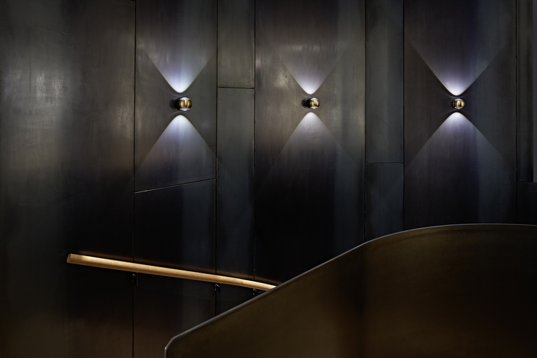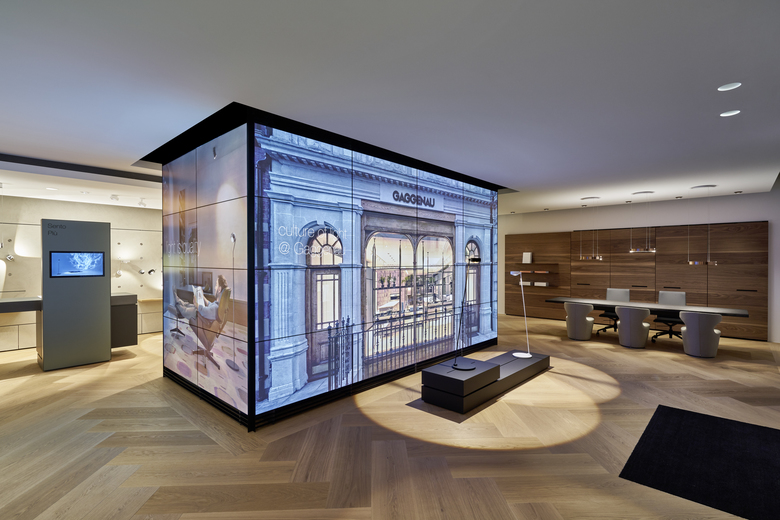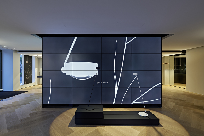 The presentation of Occhio’s lighting systems along walls and ceilings is fully integrated in the plastered walls, offering electrified plugs and rails, allowing for a flexible plug and play visual merchandising. Customers are visually guided through the product area by vertically arranged shafts which mark the product categories with an integrated screen and cantilevering table with an integrated showcase which displays the product in a most delicate manner. The visible surfaces are made from satinated glass, carrying a mirror on the backside and an inbetween colored layer of film.