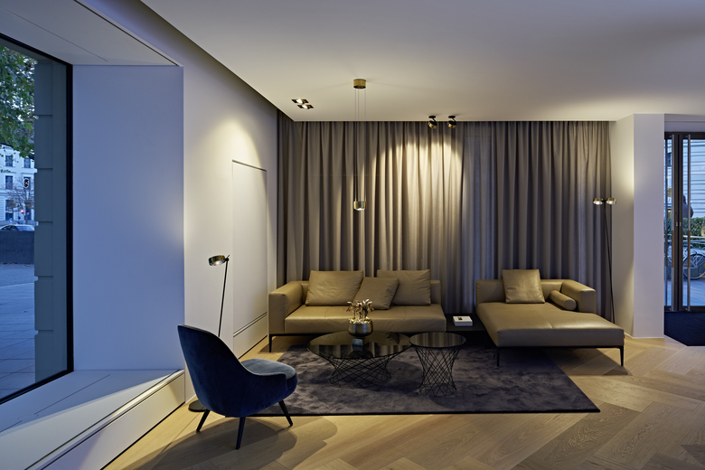 Entering the space nothing reminds of a retail store at first sight. The general mood and impression reflects a contemporary and highly sophisticated home interior, defined by precious materials and a soft tonality. The lights are naturally arranged with the carefully selected furniture pieces and create an uplifting atmospheric experience.