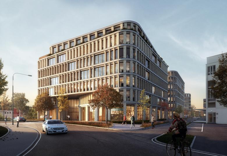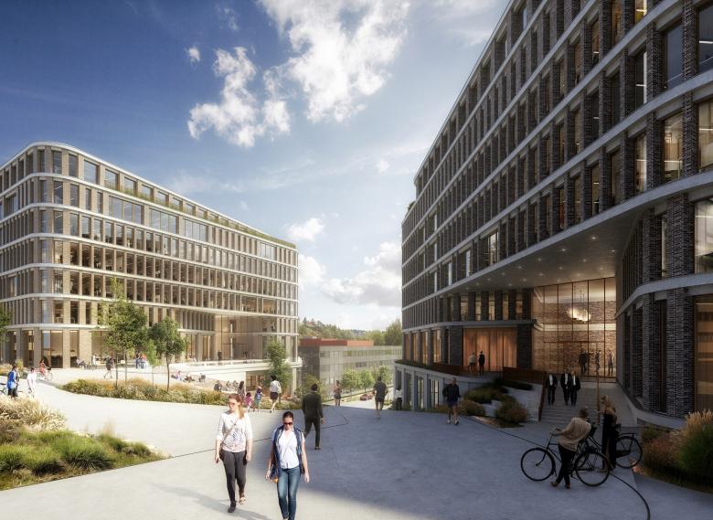 The municipality's desire for a green axis and more pedestrian, bicycle and road connections through the area has guided the design of the office volumes. Due to the level difference, the slope ratio and property boundaries, the axis is placed as a diagonal through the plot. A unifying square will be established on the client's property. The goal has been to create a place that eventually becomes a part of a city, and not a car complex. By thinking of the city, the buildings will be able to change over time, and be used for other functions.