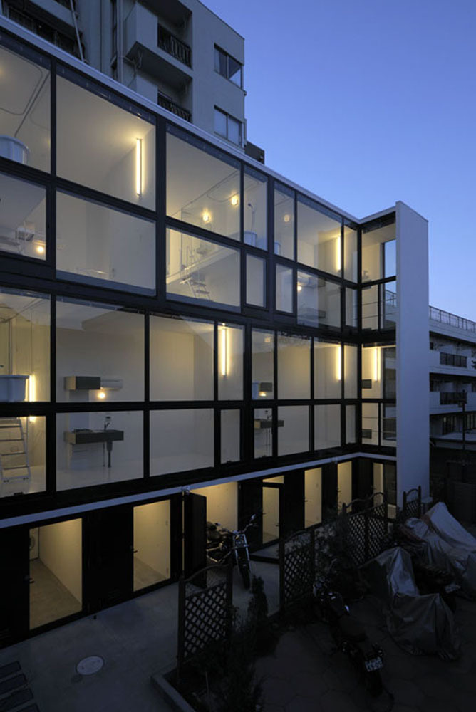 Studio with motorcycle garage. Com-position for the view of the cluster of high-rise buildings of Shinjuku. The ceiling height of the garage is lowered, the ceiling height of the 2.3th floor is adjusted to 3.4m, and the bathroom is lifted up to the height for a half floor. The space under that can be variously used depending on resident's idea.