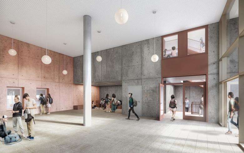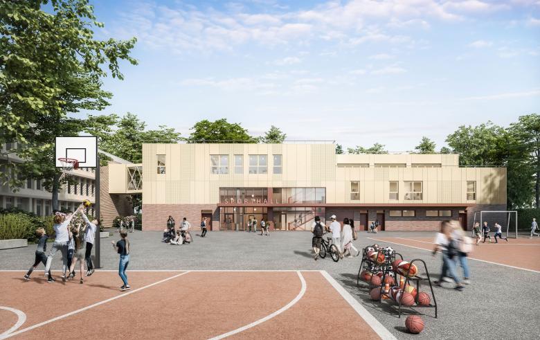 The new building will be carefully integrated into the campus, taking into account the homogeneous structure of the school grounds. Particular importance is attached to ensuring that the new extension blends harmoniously into the existing surroundings, while at the same time presenting a new quality and added value to the outside world. To optimise the orientation of the new building, the main entrance to the new sports halls and the toilet facilities were deliberately positioned so that they open harmoniously onto the schoolyard.