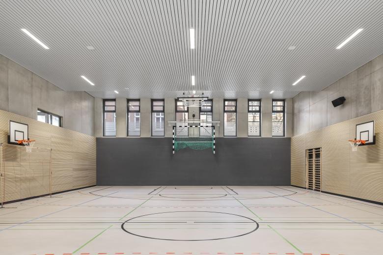 The lowered integrated sports hall on the ground floor of the new building saves space and offers added value. Thanks to its central location, generous glazing, and views both inside and outside, the hall becomes a visible, lively part of everyday school life.