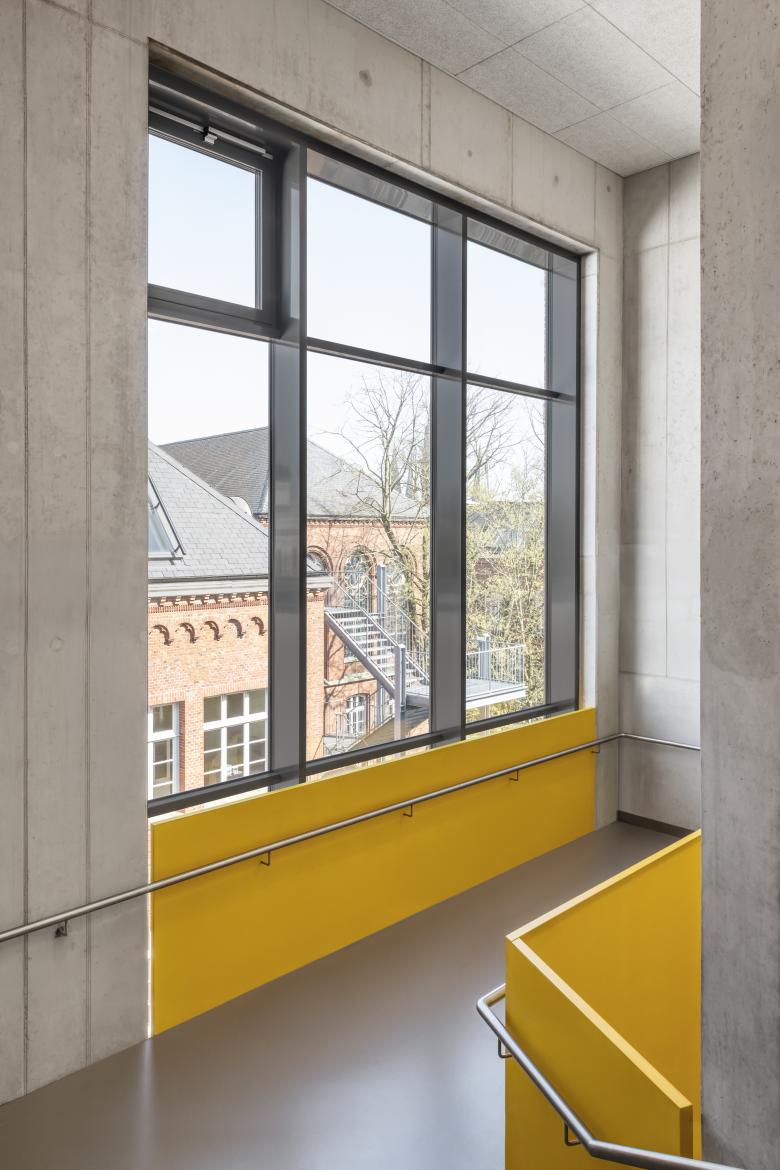 Delicate bridges and an elevator connect the existing and new buildings across all levels in a barrier-free manner. With green roof areas, photovoltaics, efficient technology, and durable materials, the new building meets high sustainability standards. The result is a future-proof building ensemble that promotes learning, interaction, and community.