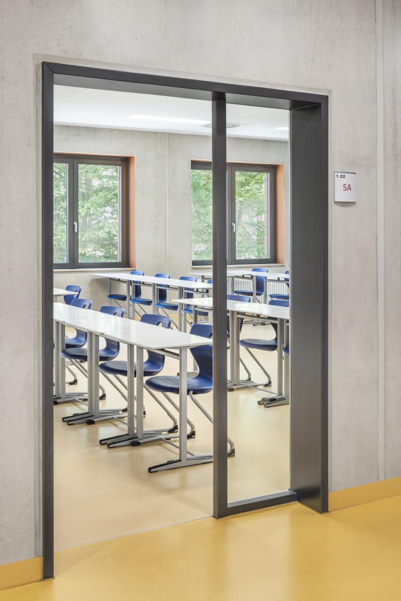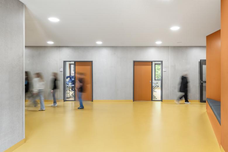 Inside, the new building focuses on flexible structures. The learning spaces are designed to facilitate both collaborative work and individual study. The room layout is complemented by specialist rooms, music areas, and a full-day area with variable use.