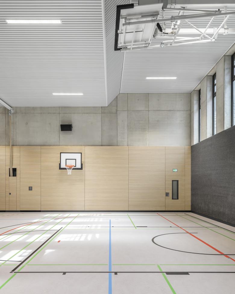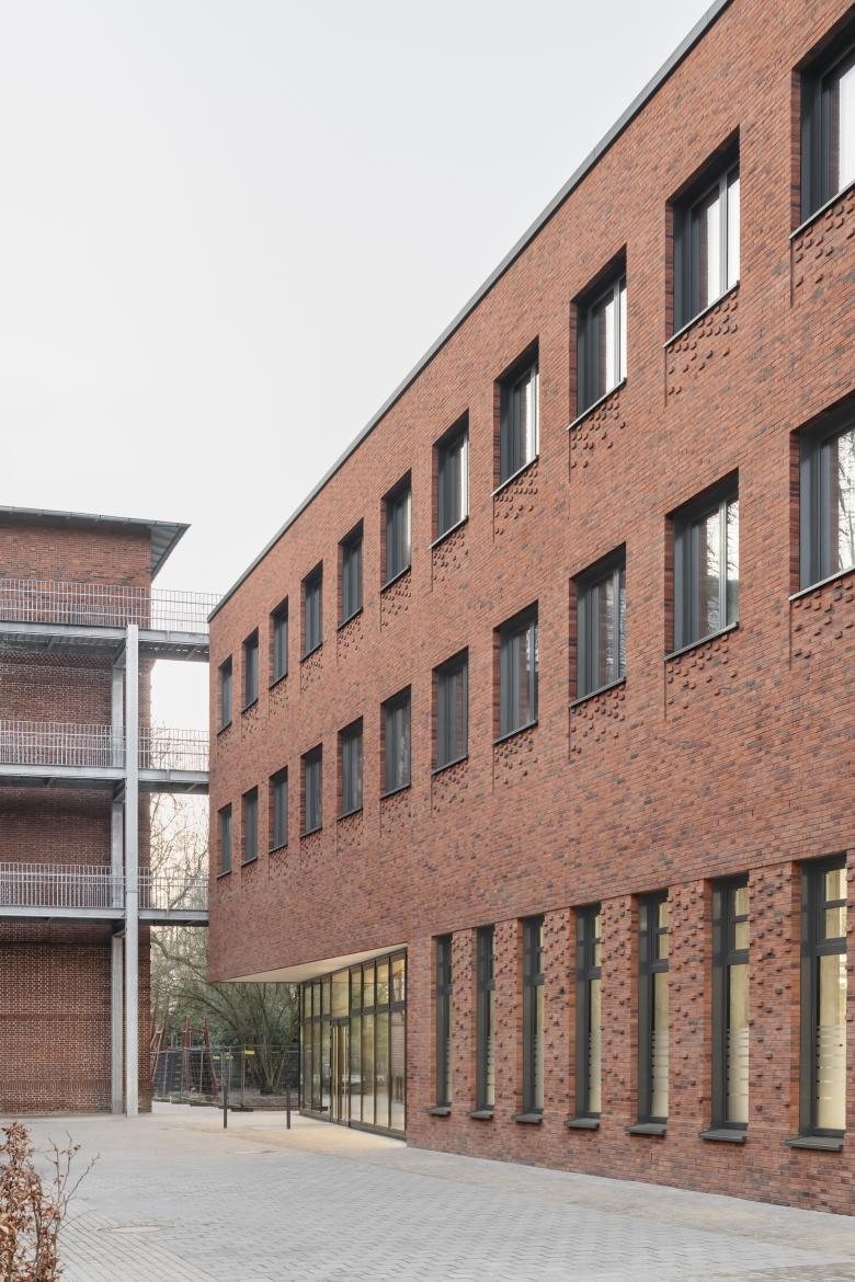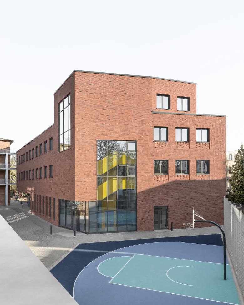 The new building replaces a former sports hall and frames the schoolyard with its clear cubature. With red brick and a dark roof, the new building references the existing structure, but complements it with its own independent, modern language. Generous glazing creates transparency and connects interior and exterior spaces.