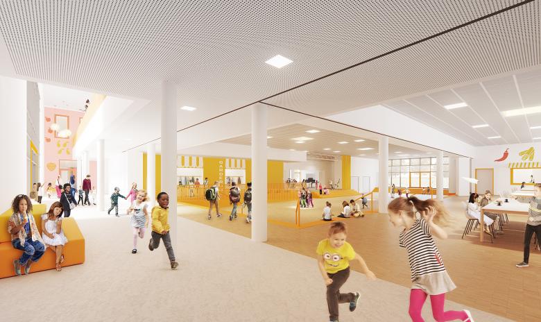The Mühlenberg district in the south of Hanover is receiving a central educational and community center with the replacement building for the primary school. The design takes up the cultural diversity of the district and creates an intercultural marketplace as a meeting place. This new meeting place strengthens the existing qualities of the surrounding area and creates a protected yet open space that symbolizes the intercultural and inclusive orientation of the school.