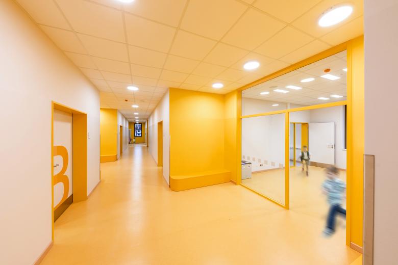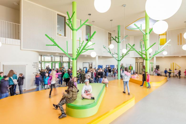 Inside, the school is a colorful forest of adventure. Green, yellow and orange guide the way through the learning landscapes, while large pictograms and symbols help with orientation. The light-flooded foyer can be used multifunctionally as an auditorium and event room. Light domes and luminaires create a pleasant atmosphere in which to relax and learn.