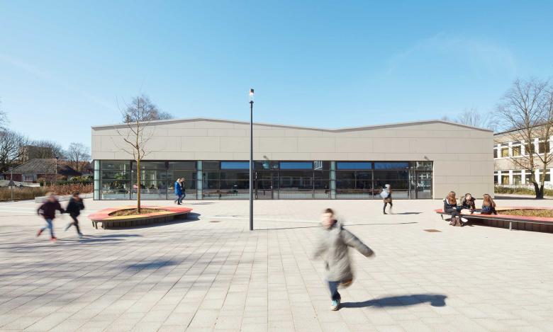 The façade of the canteen blends harmoniously into its surroundings and creates a friendly, inviting atmosphere through the use of sandstone-coloured Eternit panels and large windows. The forecourt, which directly adjoins the canteen, can be used as an extended terrace in good weather and thus increases the quality of the school grounds.