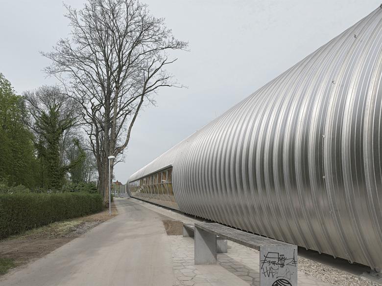 2022. Ansicht Süd: Verglaste Nordfassade mit Bowl