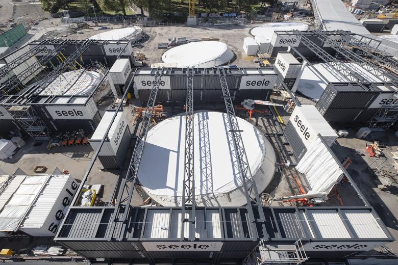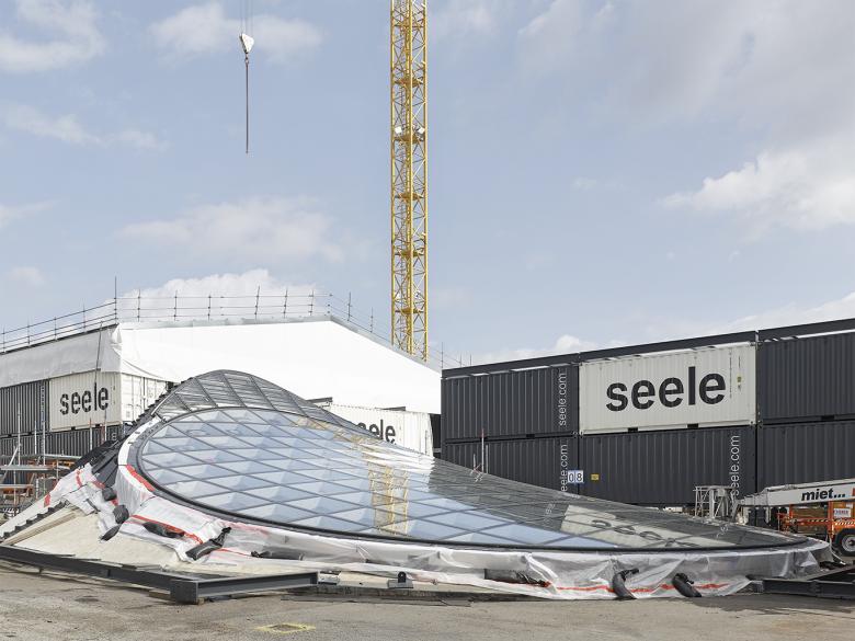 A light eye is made up of 8 steel construction segments. Each segment is suspended and adjusted using chain hoists and heavy-duty belts over 3 lattice girders. The segments can then be welded together to form a steel mesh structure - at any time of year. This is because the assembly area above the light eye is completely covered. Sea freight containers form a container enclosure. These serve on the one hand as a supporting structure for the 3 lattice girders, which are important for fixing the steel construction segments, and on the other hand as a trailer for the roof construction.