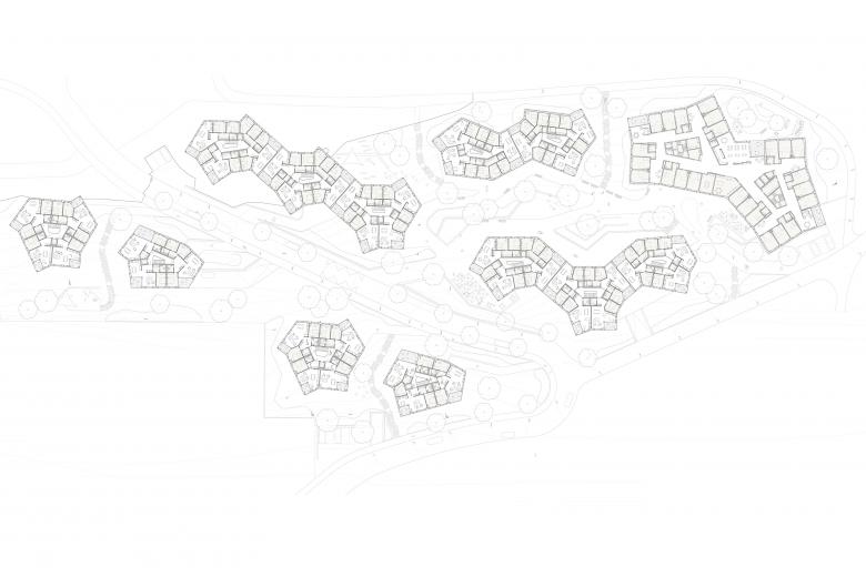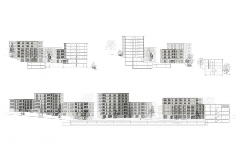 Die Siedlung profitiert von einer aussergewöhnlich hochwertigen Lage. Am Rand von Horgen, hoch über dem Zürichsee gelegen öffnet sich von Nordosten bis nach Süden hin ein fantastischer Ausblick auf den See und die Alpen. Die Gebäude liegen parallel zum Hang und definieren in ihrer Mitte einen zentralen Aussenraum. Es sind acht unterschiedliche, stark gegliederte Baukörper entstanden, welche die Gebäude mit der Landschaft verzahnen. Ein abwechslungsreiches System aus Rampen und Stützmauern machen die steile Topografie zu einem wichtigen Thema innerhalb der Siedlung. In ihrer Gesamtheit generieren die unterschiedlichen Bauten eine Abfolge von verschiedenen Freiräumen mit angenehmen Proportionen, differenzierten Raumsequenzen und spannenden Blickbezügen. Durch die gestalterische Akzentuierung bilden sich unterschiedlichste Orte mit hoher Aufenthaltsqualität für die Bewohner der Siedlung und des Pflegezentrums.