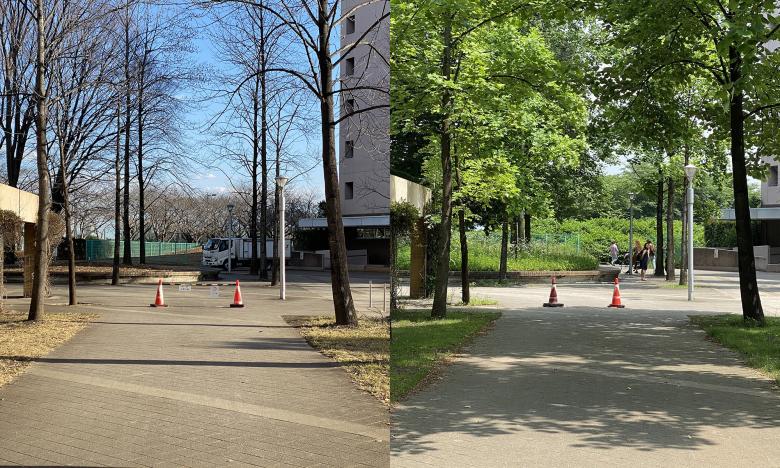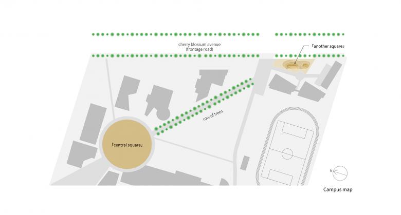The site was designated at the end of a tree-lined avenue extending from the university’s central plaza. It was a hill-like place with a height difference of about 2 meters, and I was explained that the hill was made of the leftover soil that had been piled up when the student dormitory next to it was built. The site was segregated by surrounding chain link fence, and it seemed detached from the entire campus as being located at the far end where weeds grow so thick that you might hesitate to enter in the summer. There was a cut in the center that divided the hill into two, and a smoking area was set up at the back, probably because it was out of sight from the surrounding area.