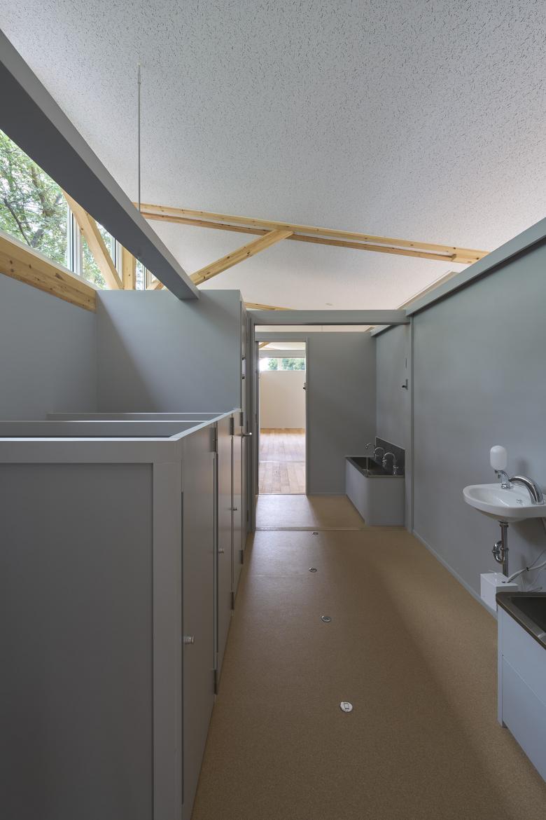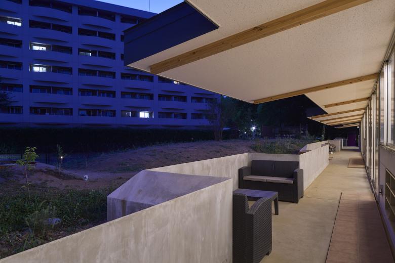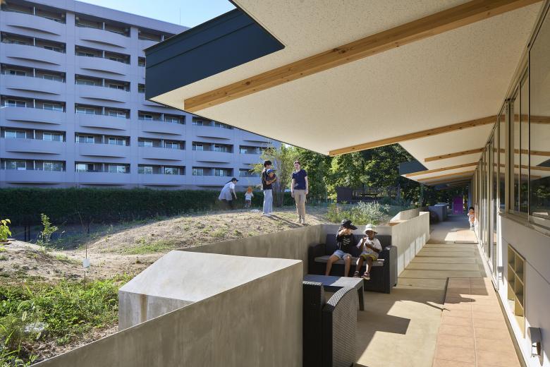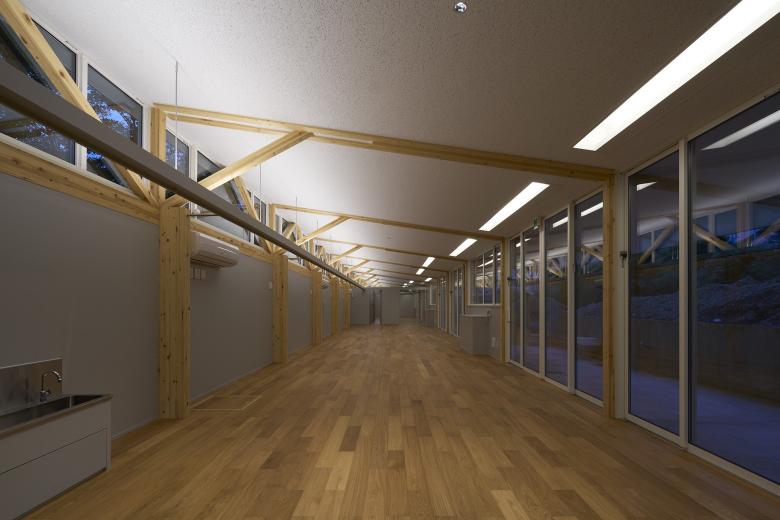 There is an outdoor hallway under the eaves of the roof, and a retaining wall separates the hallway from the hill. In order to minimize the earthwork, we opted to narrow hallway where hill is high and amount of soil is large by pushing retaining wall toward the building and broaden the hallway where hill is low. However, due to operational requirements, the hallway was broadened where wide hallway was requested to put sofas for children to gather or there is a lot of traffic and narrowed in front of the playground for children aged 0 to 1 to ensure safety. The location of the earth retaining wall was considered in order to balance both conditions. As a result, the hallway and the hill are connected by earth retaining walls that are cranked at seven locations along the 47m length of the building, and the eaves are also extended and cranked accordingly. To prevent rain from entering the hallway, the top edge of the retaining wall was cut diagonally toward the hill.