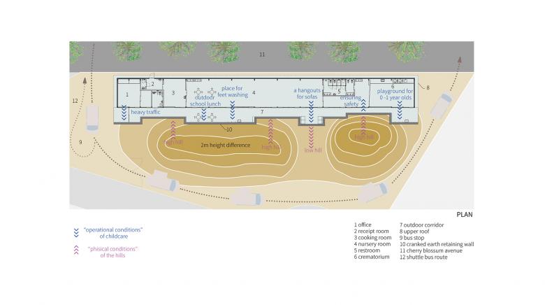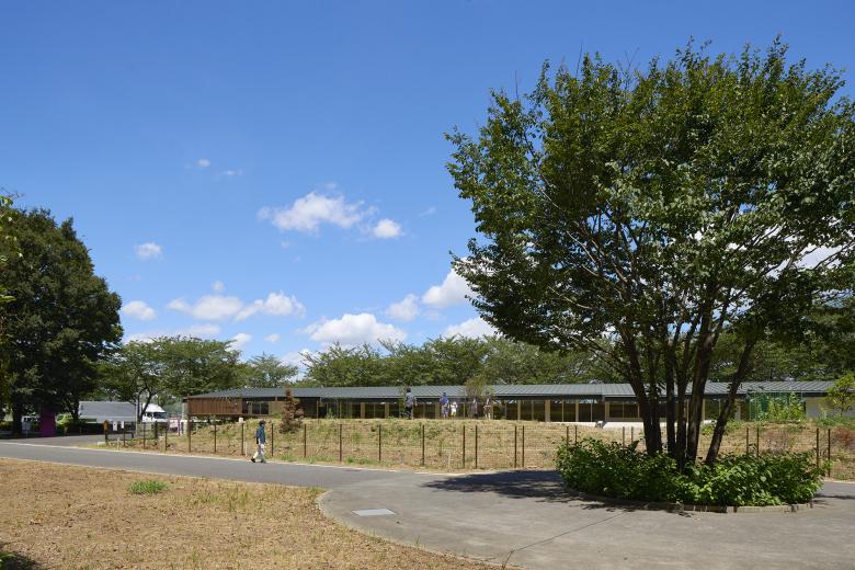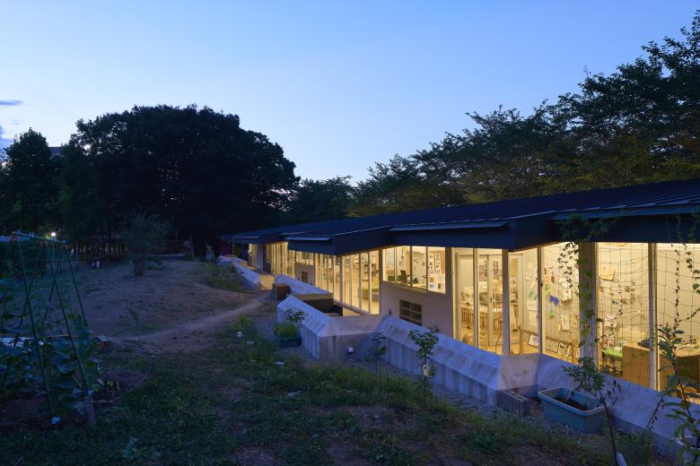 It is common for nursery schools to build artificial hills in their gardens, and after consulting with the director, we decided to use an existing hill as an artificial hill. The assumption is that the entire garden is an artificial hill and would be positively used as a three-dimensional field to accept the activities and imagination of the children. In order to reduce the amount of soil removed during construction, the school building was built away from the center of the hill, moved to the side, and stretched along a road in front which is lined with cherry blossom trees. The roof of the nursery building is kept low so that when you stand on the hill, you can see the surrounding trees and scenery.