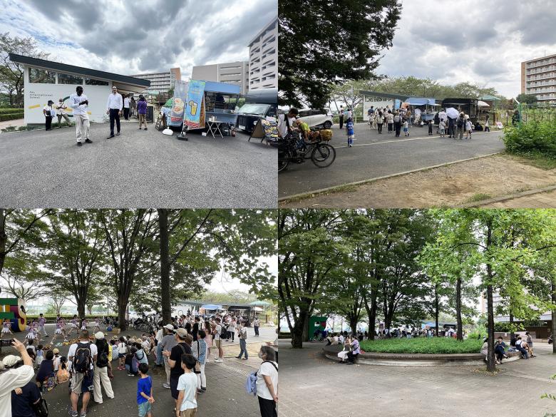 Inside the garden, a route has been set around the hill for cars to go through the site from the entrance side to the bus stop at the frontal road. The range of activities is expected to expand as various functions such as a mobile tea room and a camper for overnight childcare are introduced and “plugged in” to the nursery school. At the school’s first anniversary celebration, food trucks came and many people lined up for food, international families and local residents visited, and cheerleading demonstrations by students were crowded with many people.