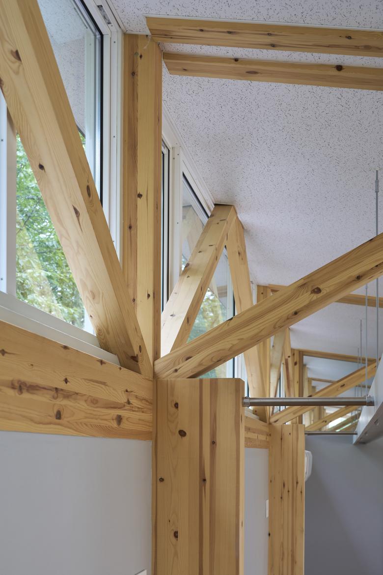 The structure is made of wood in consideration of versatility and cost, and the cross section and length (6m or less) meet residential standards. The short side of the nursery building is 4.5m, but the eaves that extend from it are a maximum of 2.7m, and the total length exceeds 6m, so the length can be adjusted by sliding a beam held at the tip like a “chopstick gun”. This allows the eaves, which have different lengths depending on the crank, to be supported by the same structural unit. This unit was repeated in 14 sets over the 47m long length of the building, and was used as the interior design.