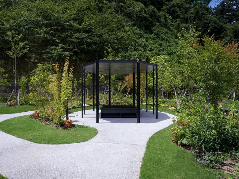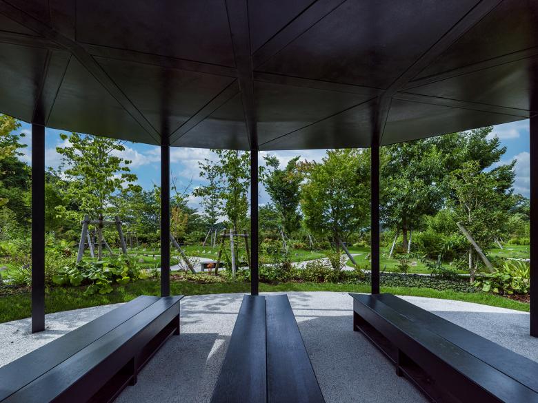 The paths have been designed to adjust sightlines and flow, creating a spatial composition that encourages the layering of memories and emotions according to the pace of walking and the length of stay. In addition, a pavilion has been built along the path as a space for conversation, meditation, reading, and rest. The pavilion is not merely a place to rest, but a device for memories that blends in with the landscape. The columns and beams made of channel steel guide rainwater from the roof to porous concrete at the base through open vertical gutters, connecting the architecture to the natural cycle.