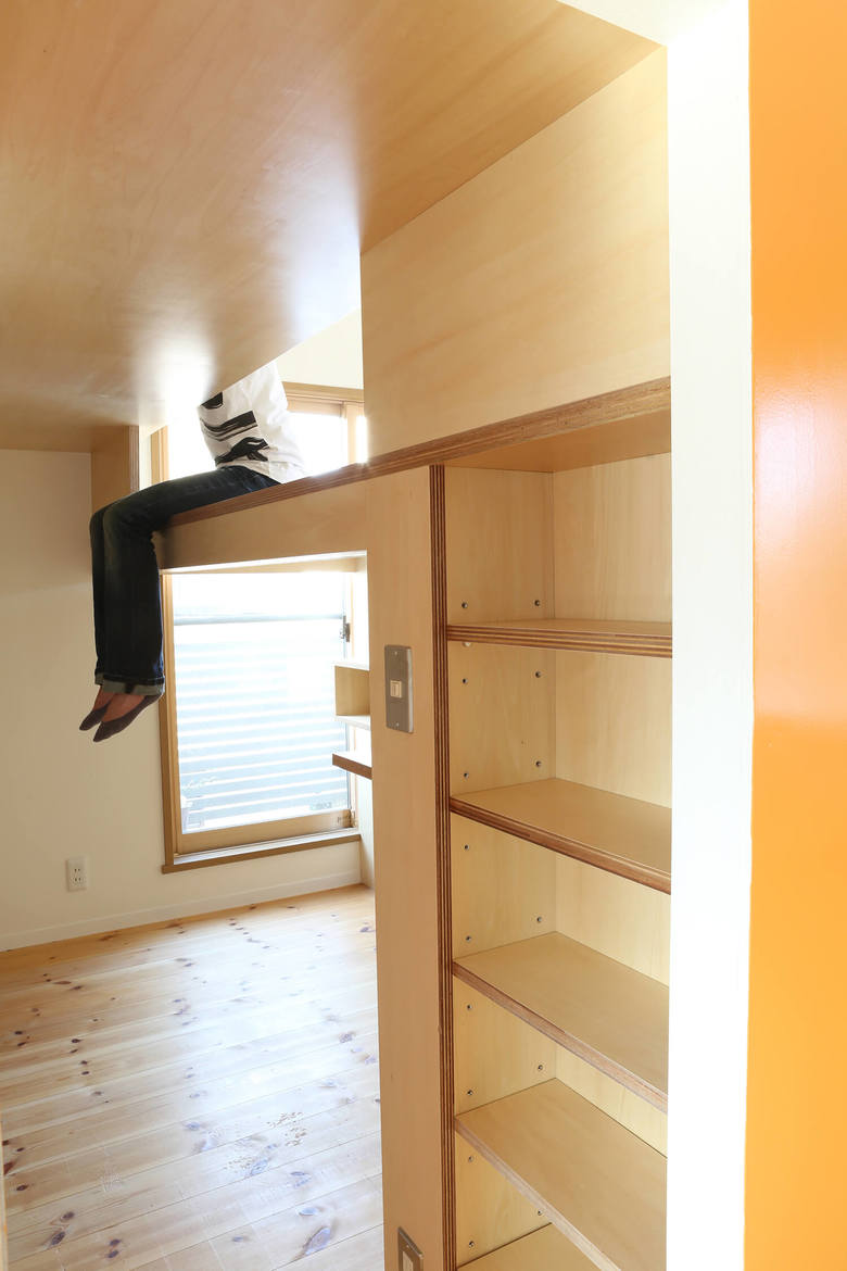 This three storey house is 10 years old residence with a precast concrete structure. We have renovated a part of 2nd and 3rd floor as an owner`s residence, and the rest is for rent. A box was proposed like big furniture to improve usage of kids space by combining beds and desks together. The bottom of the furniture is separated into two bedrooms. The top part is a kids play area, and at the same time, it functions as their study desks. The desk is a corridor ceiling which connect to their bedrooms. While they use their desks, legs will stick out to the corridor. The kids’ area is opened towards the kitchen and the living room so that the family can communicate easily.