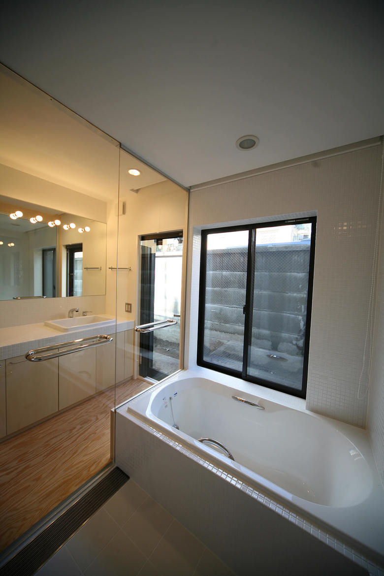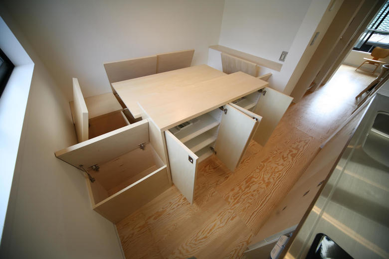 Contrary to a standard house, with its hierarchy between the rooms’ area from the wide living room to the small bathroom, this house has all its rooms with approximately the same area. The central staircase divides the space into living room and dining-kitchen, entrance-study and bathroom, children’s and parents rooms. As the space is limited, the living room becomes compact with everything within reach. Conversely, the bathroom is wide, emphasizing bath time as for enjoyment and leisure time. Moreover, in a way to enlarge those small individual spaces, wall furniture are extended out of the limit of the rooms as continuous element from an area to an other.