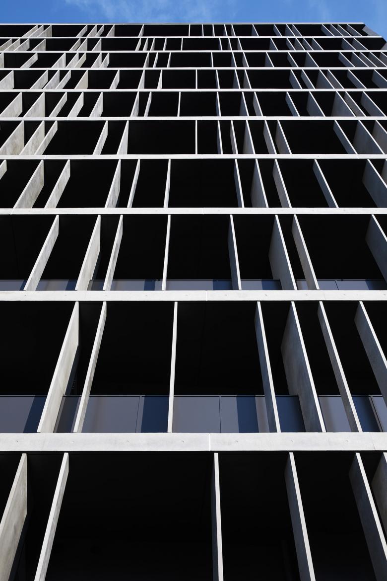 Particular attention was therefore paid to design a characterful building to match the post-war buildings surrounding it. Our strategy was to emphasize the concrete floor slabs in order to amplify and echo the area’s horizontal linearity. We also used the paper-thin concrete fins (40mm in thickness) to break the monotony and introduce playfulness.