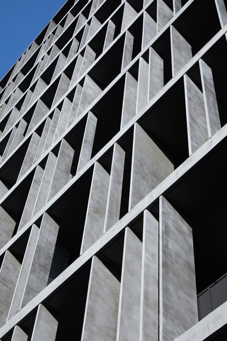 When you look at the entire building from the front elevation, these concrete fins appear as sharp as a Samurai’s sword cutting through the air. If you look at the buildings from the side, however, you can begin to appreciate the texture of the exposed concrete, which changes its appearance with the intensity of the light.