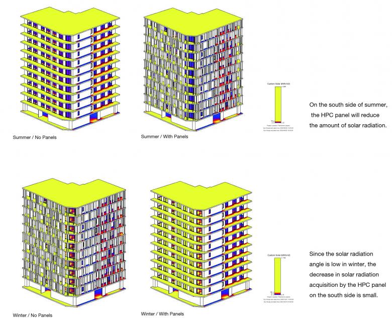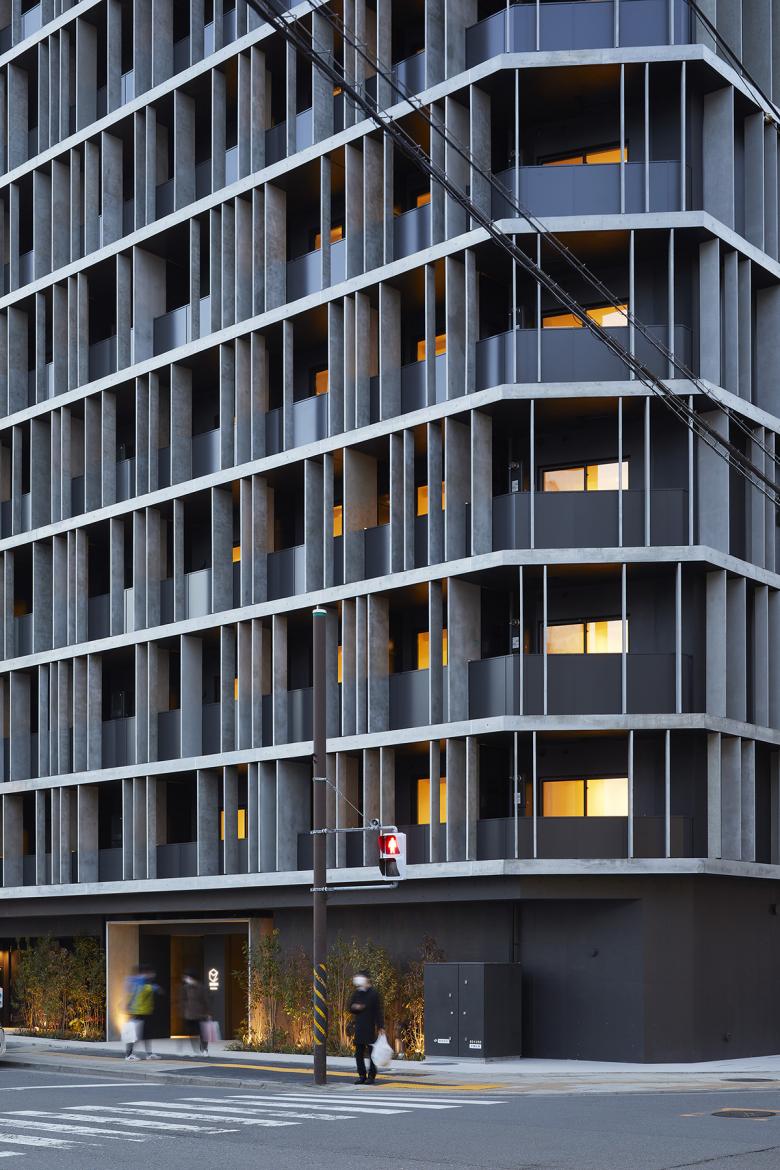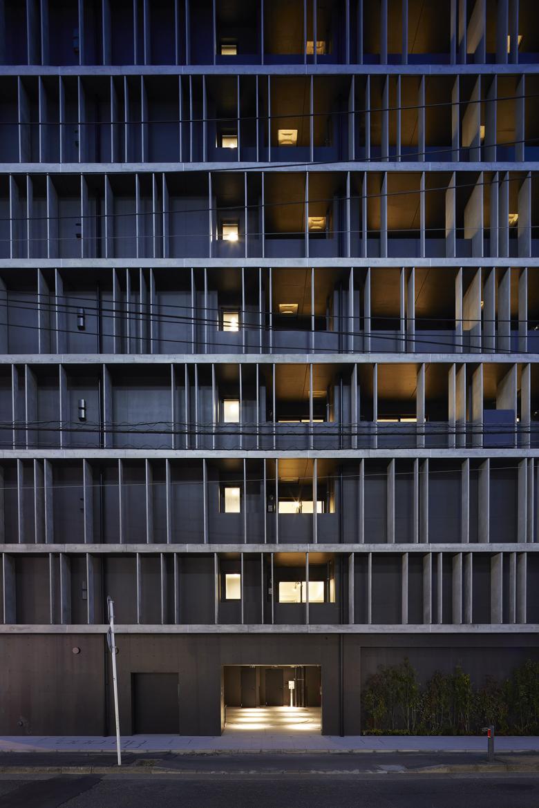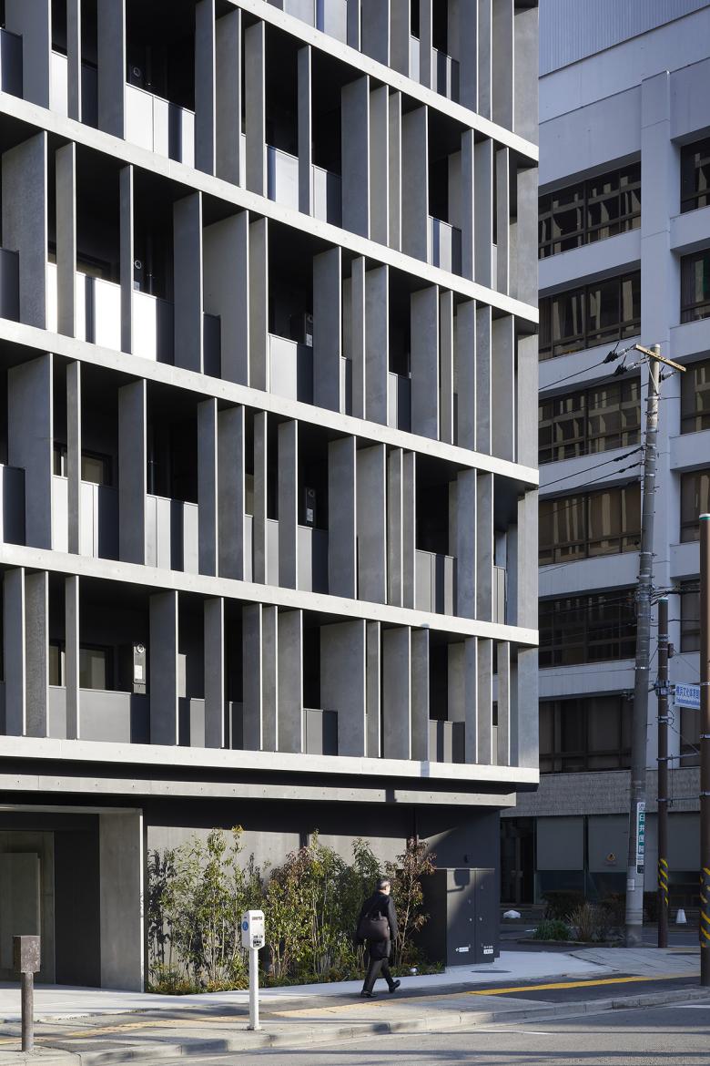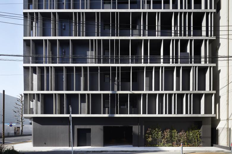 The concrete fins on the facade are made with Hybrid Prestressed Concrete or HPC. They have been developed and patented by the Japanese company HPC Okinawa in 2015. The panels used in this housing block have been manufactured by Kooge Concrete company in Tottori prefecture, south of Japan.