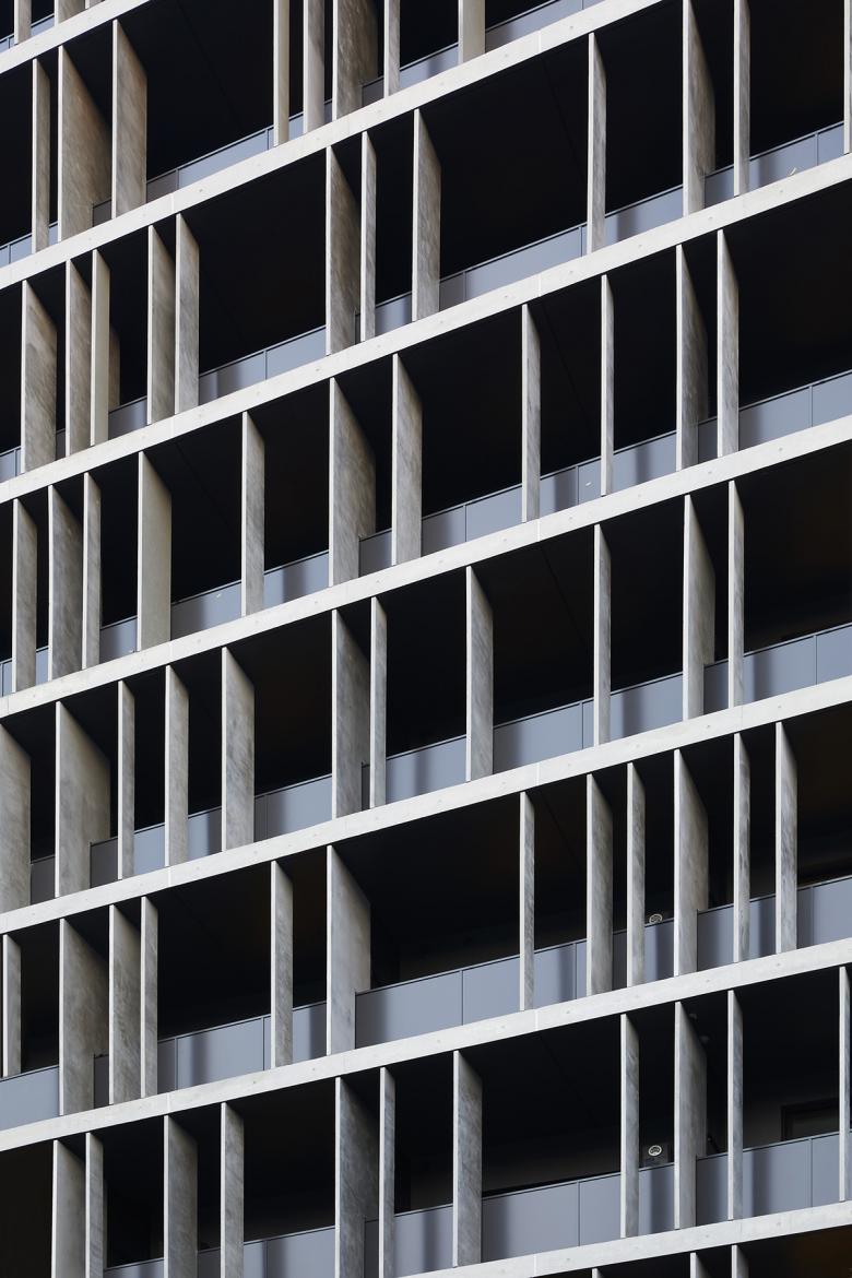 The vertical concrete panels have been added to the facade randomly, concealing the small units behind them. Panels, thin as they are, are unobtrusive, befitting the scale of the individual units. Each unit has a width of just 2.9 meters. The depth of panels vary between 200mm to 900mm, with some functioning as brise-soleil and some as dividing walls between different units, whilst others are more decorative, framing views of the city.