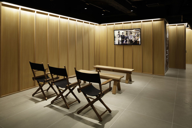 The refreshment counter for purchasing drinks and snacks, small bookstore, restrooms, and smoking area were finished to look like a movie scene or set. The walls behind each scene were framed plywood, a striking reminder that movie scenes are faked and merely surrounded by imaginary fixtures. The ambience is like a movie studio. The famed exhibits tied to the featured movies at Musashino-kan Shinjuku are now installed like movie sets.