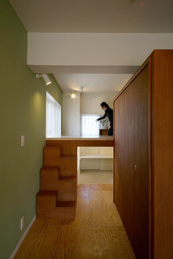 This flat is part of a project to fully renovate a 21-year-old building formerly used to house company employees. Aside from the kitchen and bath, the unit is a completely open skeleton that can be molded to the needs of the residents by rearranging various items of furniture. By changing the height of the floor, however, we were able to create gentle partitions within the open space. Examples include the spacious living area and raised sleeping area with storage space and plumbing underneath, the sunken “kotatsu”-style dining area, and the open kitchen.