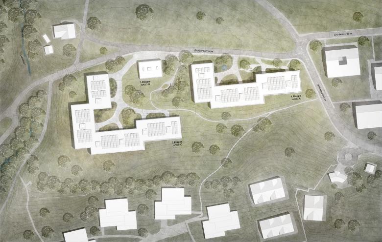 Die städtebauliche Absicht im Erliberg besteht darin, den landschaftlichen Aspekt von grosszügig bemessenen Wiesen, welche die Hanglandschaften am Ägerisee prägen, trotz Bebauung spür- und erlebbar zu behalten. Entlang des Moränenzuges werden zwei langgezogene Gebäude erstellt. Die Konzentration der Nutzung auf die zwei Gebäude erlaubt es, eine grosszügig bemessene Umgebungsfläche zu belassen, welche den zukünftigen Bewohnern für die Erholung zur Verfügung gestellt werden soll. Die zwei Gebäude formulieren den topgraphischen Übergang auf der Parzelle von Süden nach Norden und bilden den baulichen Abschluss gegen Norden. Typologisch beziehen sich die zwei längs im Hang liegenden Gebäude auf benachbarte Sanatoriumsbauten.“