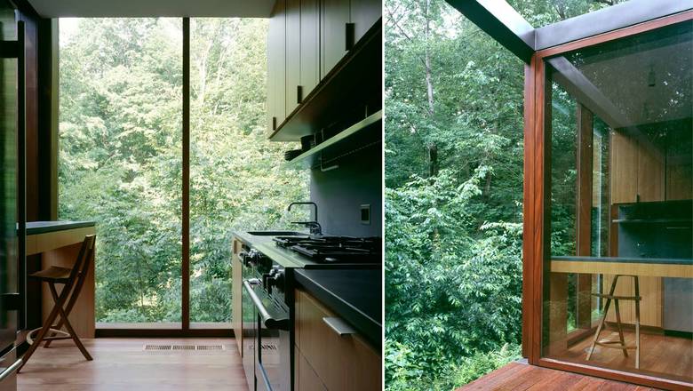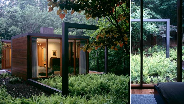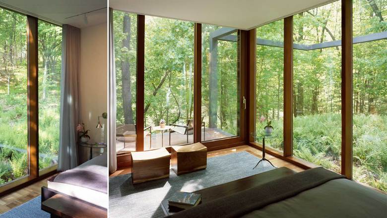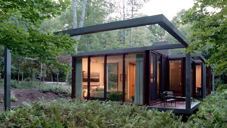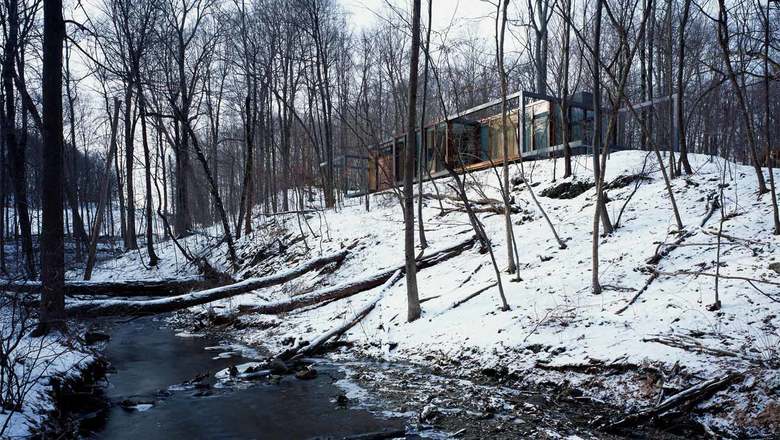 Balanced above a bend in Ryder Creek, the guest house is located in a mature deciduous forest of oak, hickory, and birch. The two-bedroom, 1300sf house is held within a continuous structural frame of eight-inch steel that weaves through the site, blurring the boundaries between forest and house. Enclosures and terraces are formed by panels of wood and glass that slip between, over, and through the frame as it meanders among the trees. The house is reached by a path through the woods from the Main House meadow. Each room of the house looks to a different region of the site, emphasizing closeness and connection to the landscape.