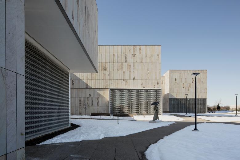 Natural light amplifies the experience of the Palmer’s collection and program from within the museum. Soft blankets of light fall from overhead diffusers into the galleries. Metal sunscreens form ornamental wall tapestries of light that both protect the art and join the visitor to the surrounding campus and views of the neighboring botanic gardens and the surrounding Nittany Valley mountains.