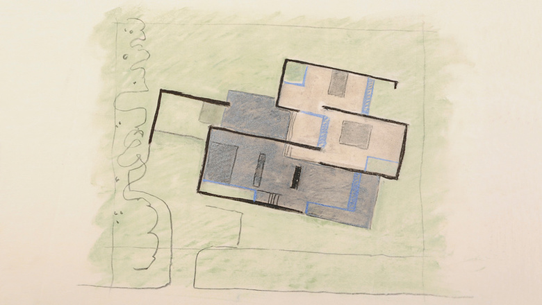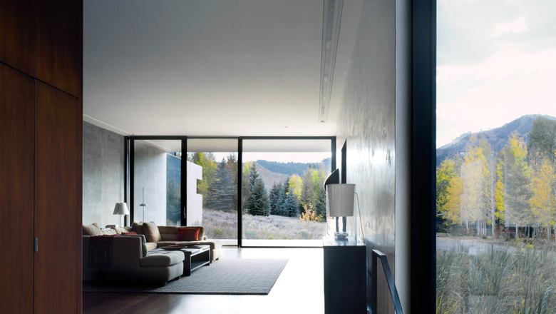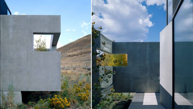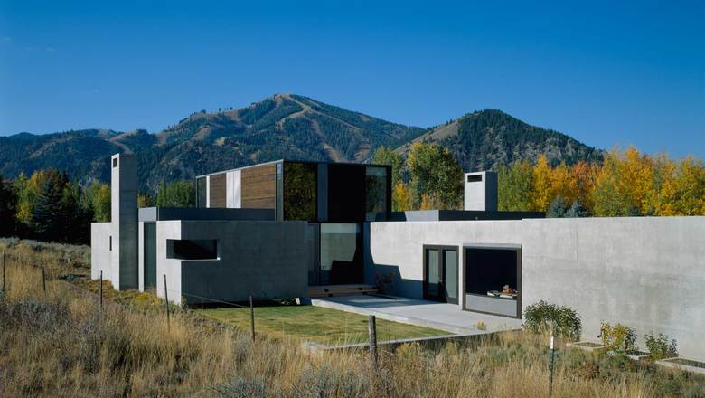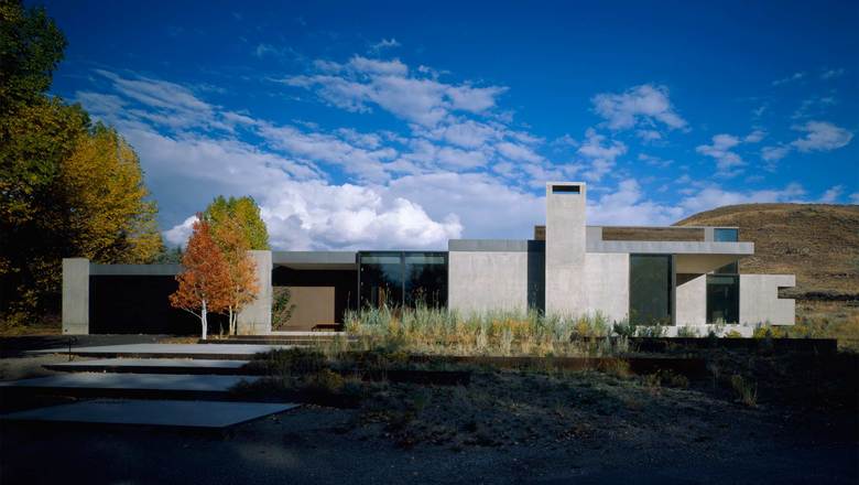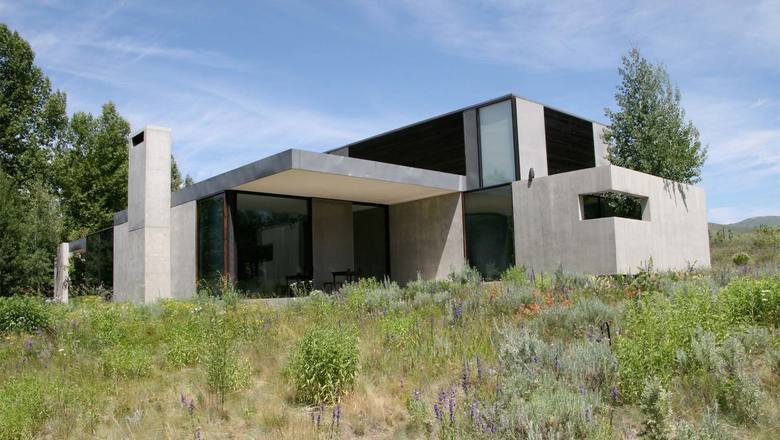 Against the extreme conditions of the high mountain valley, the 4500 sf house creates a quiet sanctuary and gathering place. Four sets of interlocking concrete walls step up the base of Penny Hill. The smooth, sitecast walls weave through the meadows, inverting the landscape with alternating rhythms of enclosure and exposure - disclosing spectacular views while containing private outdoor courts and gardens. The simple roof forms rise and fall between the walls, varying the volumes to create both intimate places of repose as well as generous rooms that open to the landscape.