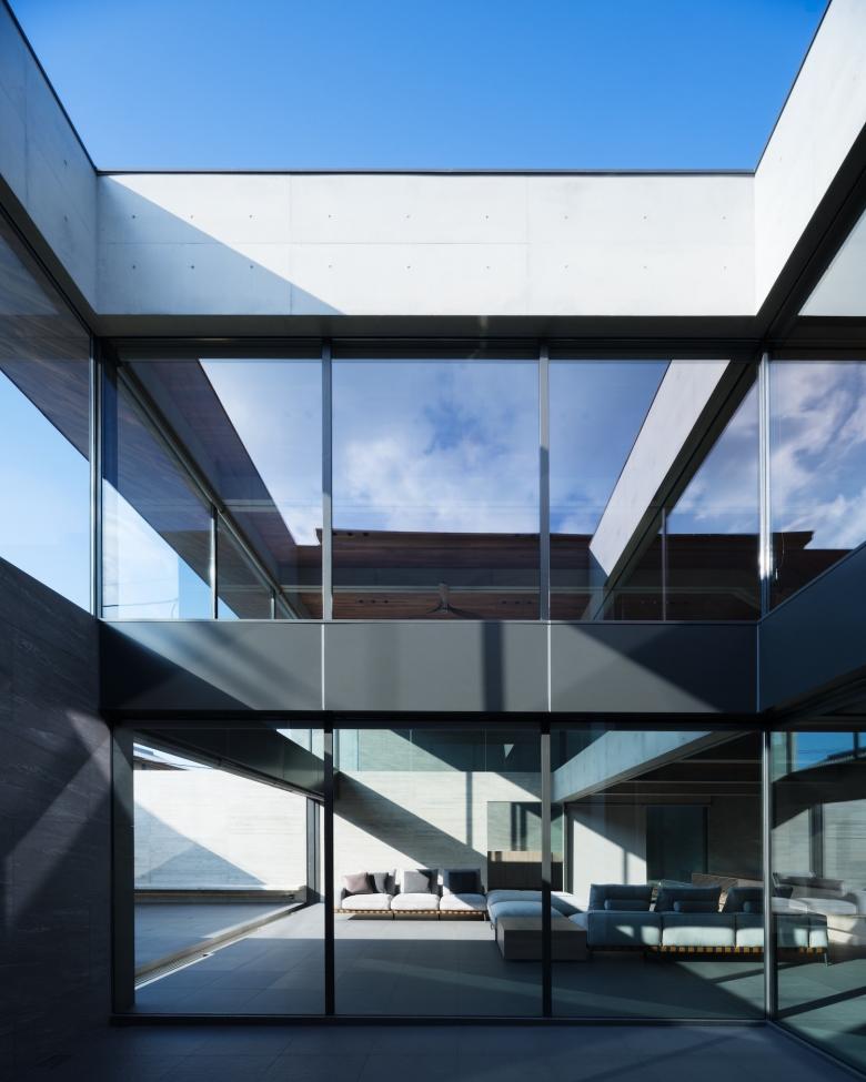 The main entrance opens into a two-story atrium space, where light streams in from high windows positioned on both the north and south sides. Guests are warmly welcomed by a cozy entrance courtyard visible directly ahead.The family living area, located within the atrium space, is complemented by a total of three courtyards of various sizes. In addition to the entrance courtyard, there is a courtyard in the kitchen and dining area that draws natural light all the way in to the back of the kitchen, as well as a central courtyard equipped with a bench and full-opening sliding doors. Each of these distinct courtyards makes a unique contribution to the spatial experience within the home.