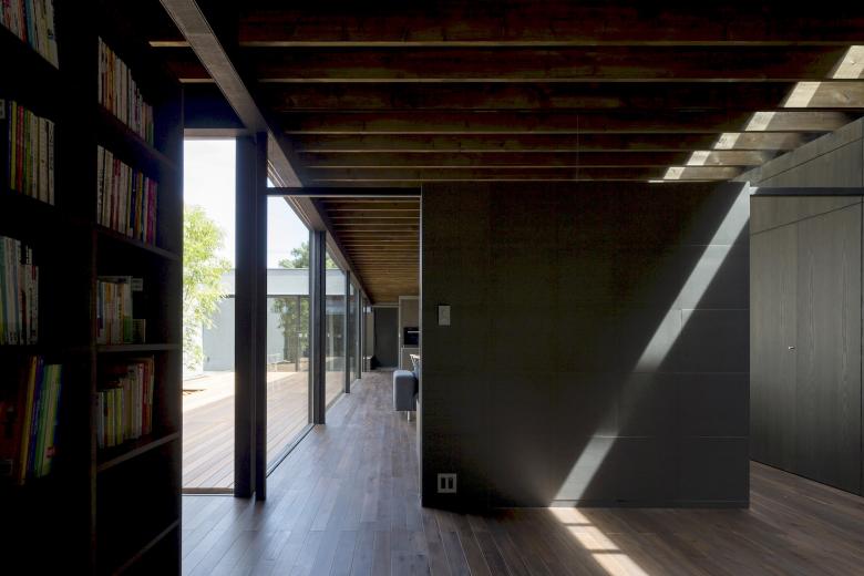 The simple exterior is clad in black Galvalume (aluminum-zinc alloy coated sheet steel). Past the approach, which evokes the nostalgic mood of a narrow lane, one steps into the entryway and encounters a large courtyard at the center of the C-shaped plan. Next to the entryway is an open tatami-floored room that can be used as either a guest room or a second living room, and beyond that is a bedroom for the client’s mother. Both rooms enjoy excellent views of the courtyard. On the other side of the entryway is an open, sunny bathroom filled with light from an adjacent courtyard that also serves as a laundry-drying area.