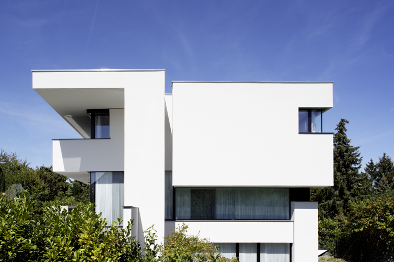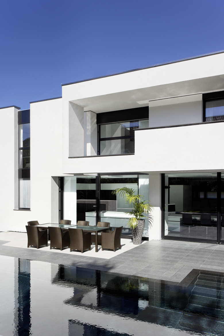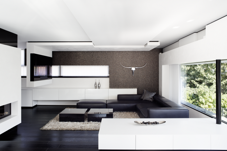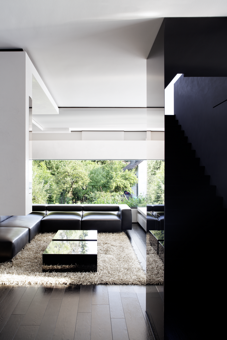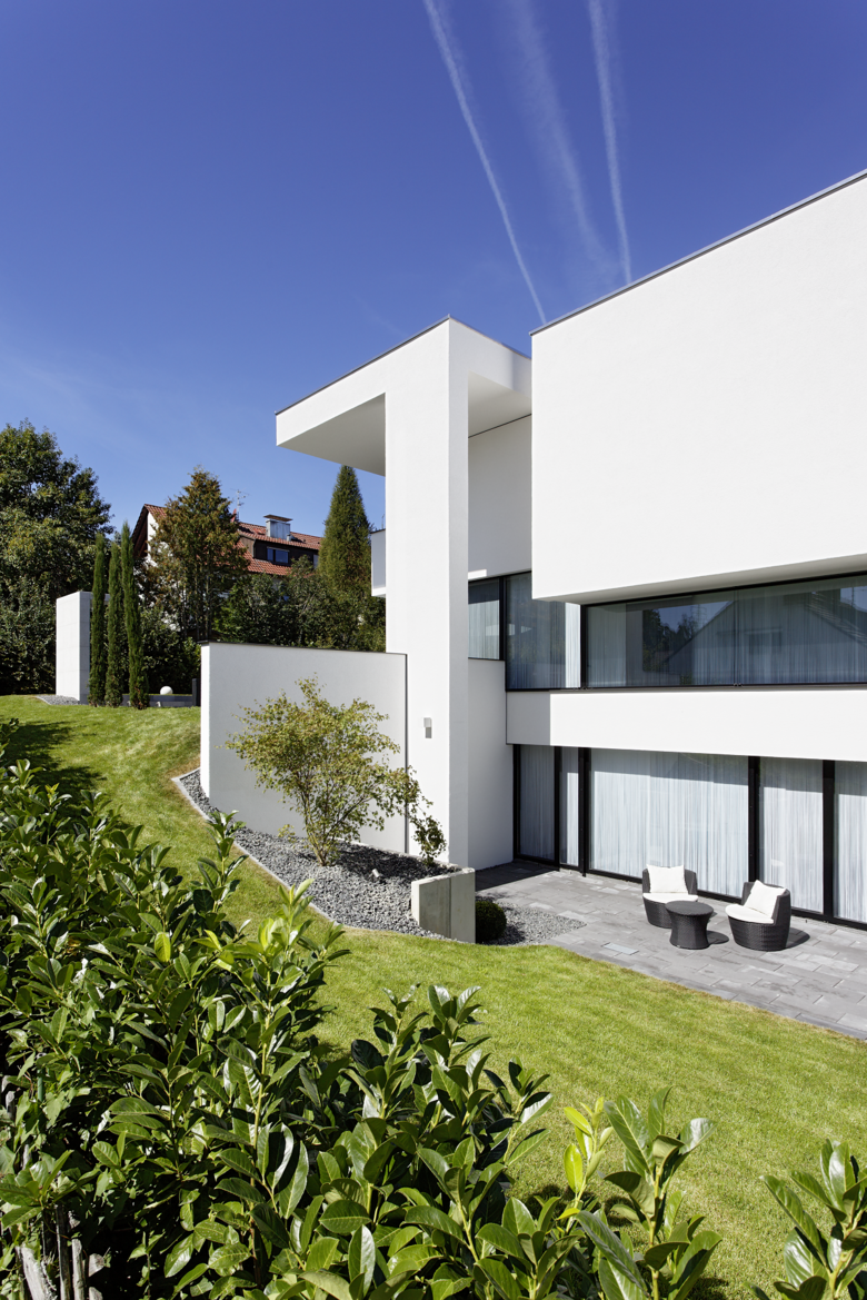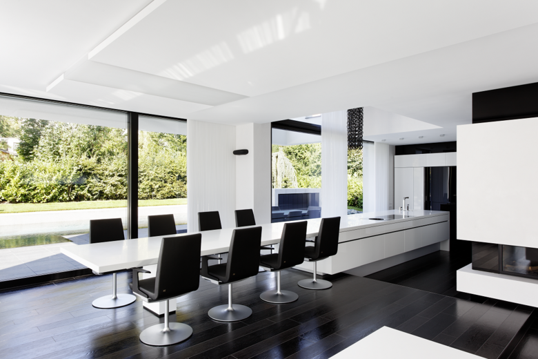 Located on the outskirts of Stuttgart-Vaihingen on a hillside, the villa Casa Murano appears as a cubic, three-storey building with a plastic articulated facade. The effect of the forward and backward jumps in the facade is enhanced by the alternation of white plaster and recessed black elements. The inside and outside facilities clearly show a continuation of the design principle. Thus, the ground floor is divided by height as graduations in the soil and suspended ceilings. In order to achieve a harmonious whole, had the architects make all furniture elements measured. A spatial relation between ground and upper floors in the kitchen is also produced by an air space above the kitchen area. This is also where a four-meter high chandelier from Murano glass elements is suspended. Thus, the villa got its name: Casa Murano.