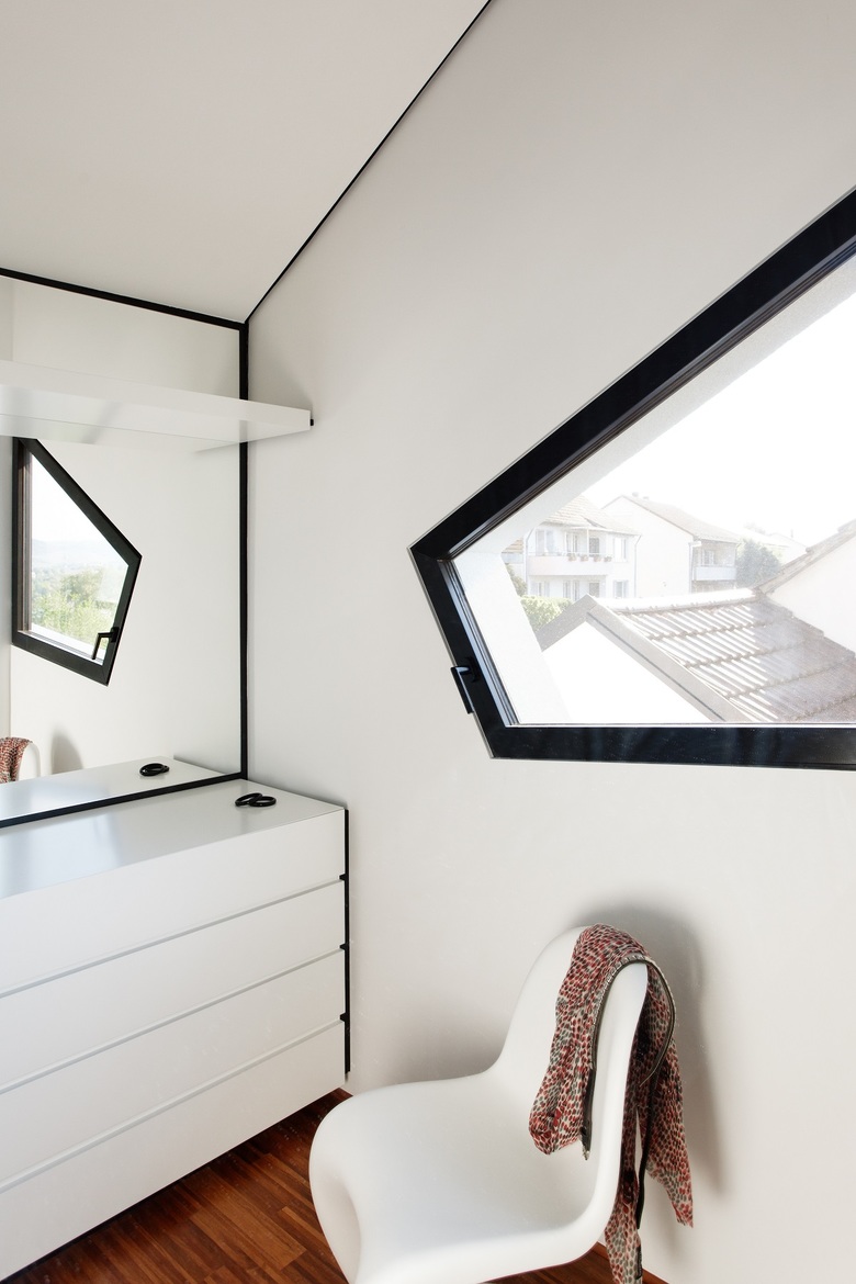Built in Waiblingen on a hillside property that is limited in size by the trailing edge of a former quarry, different facades have been developed for this single family home. While the road side is very close and only two floors are visible, all three stories are open to the back garden. The roof is designed as a saddle roof and is in line with the surrounding buildings. Oblique incisions in the gable windows lead to a visual distortion of the classical type. Highly structured plastic is used to create forward and backward jumps on the front of the building which defines the buildings entrance. A gold coloured façade, made from plate material, holds together the garage doors and gates. From the garden, the plastic design helps covered areas such as terraces and balconies come into existence. In the living room there are exciting space situations created by the air space leading to the upper floor as well as by special materials used. There is a spy glass aimed towards the garage, giving the owner the choice as to whether to make the Oldtimer visible by switching on the light or to let the car disappear by switching it of. The warm coloured parquet floor and the white painted furniture create, for this scene, a quiet background. All furniture and kitchen fittings are manufactured according to designs by the architectural office and paint a consistent overall picture on all floors.