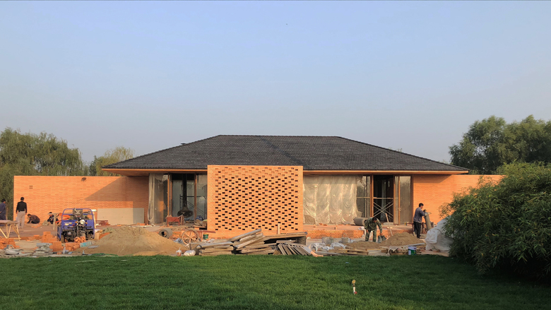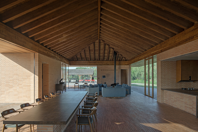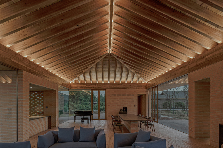 ARCHSTUDIO well handled the relationship among space, structure and materials, and tried to present the natural beauty of materials based on the characteristics of rural leisure space. The four rooms use steel framework and concrete slabs, with the wooden formwork of the in-situ concrete slabs exposed in the interior spaces. Beige shale bricks were utilized to construct the walls. The walls are composed of two vertical layers of bricks, with a thermal insulation layer in between, which improves the thermal performance, ensures identical material texture of the interior and exterior brick walls, and hides framework as well as pipes and wires of equipment. In the inner yards, large areas of the brick walls leave hollows, hence allowing natural air ventilation and light penetration. Pedestal surfaces, either inside or outside, are also paved with beige bricks. The pitched roof of the public area adopts wooden ribbed beams, with the rooftop clad in charred wood tiles. The combination of wood and bricks produces an austere, warm and natural interior ambience. In addition, the fireplace, dining table and piano further identify different public activity areas.