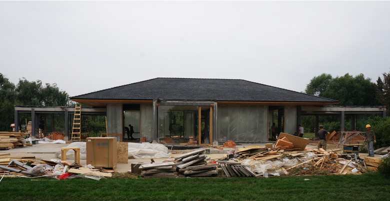 The design concept is derived from courtyard dwellings (Siheyuan), a kind of traditional Chinese residence. Siheyuan has an inward-facing architectural structure, with buildings arranged around a central courtyard. The exterior of Siheyuan is closed, while the interior courtyard is completely open, which offers little privacy for the occupants. Based on site conditions and the main functions of the project, ARCHSTUDIO decided to construct the house by borrowing and transforming the architectural pattern of traditional Siheyuan. The design team arranged four rooms on different sides in a scattered way, added a roof to the "courtyard" and turned it into a hall, and made the exteriors of the hall transparent and open, thereby letting the hall blend with the pleasant outdoor scenery, and ensuring the privacy of individual living spaces and openness for reception activities.