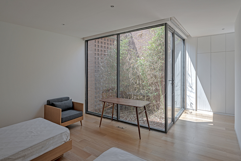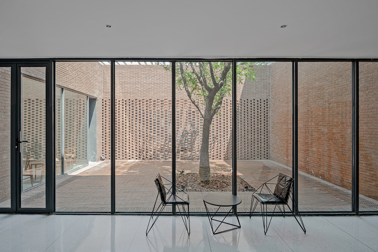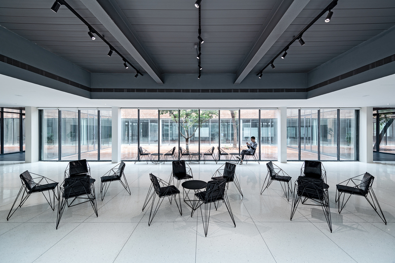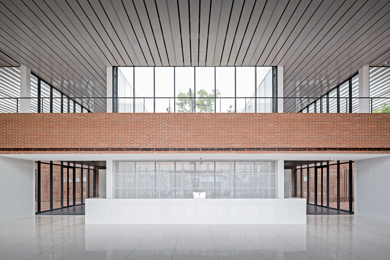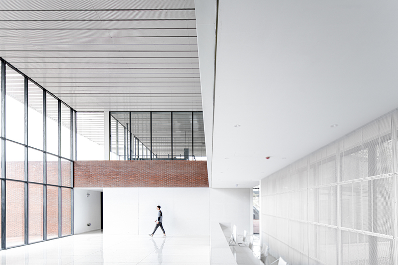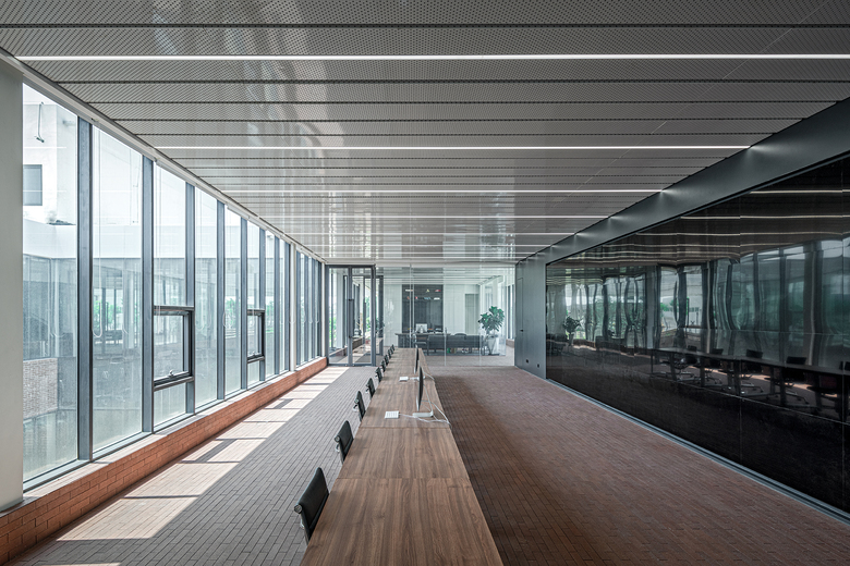 The office building is characterized by a restrained material palette, which focuses on the logic relationship between materials and space, integration between interiors and exteriors, as well as maximum expression of material languages. The front court, external walls of 1F, and part of the floor on 2F, are clad in red bricks, a type of material commonly seen on local historical architectures. From south to north, the red bricks together present an undulating image based on the architectural form. According to positions, space openings and functional requirements, bricks were laid in different ways, and hence presenting various formations and visual effects. Apart from bricks, steel materials were also repeatedly utilized, which can be found on indoor and outdoor bridges, staircases, door and window frames, and some counter surfaces within the space. Besides, work was done to endow part of the outdoor floor with slip-resistant quality. On 2F, perforated aluminum grilles were used as ceilings of interior spaces and covers of outside areas. Those grilles hide pipes and wires of lighting system, air conditioning and other equipment, which ensures the integrity of spatial interfaces and forms contrast with rough brick surfaces as well.