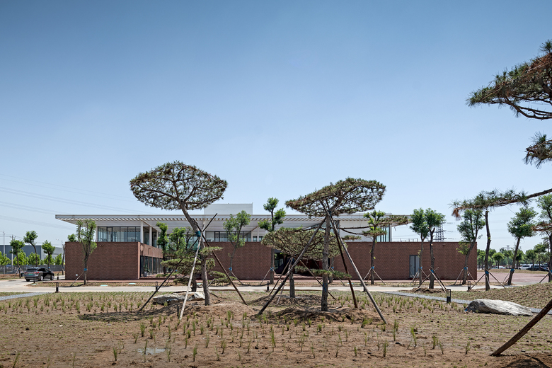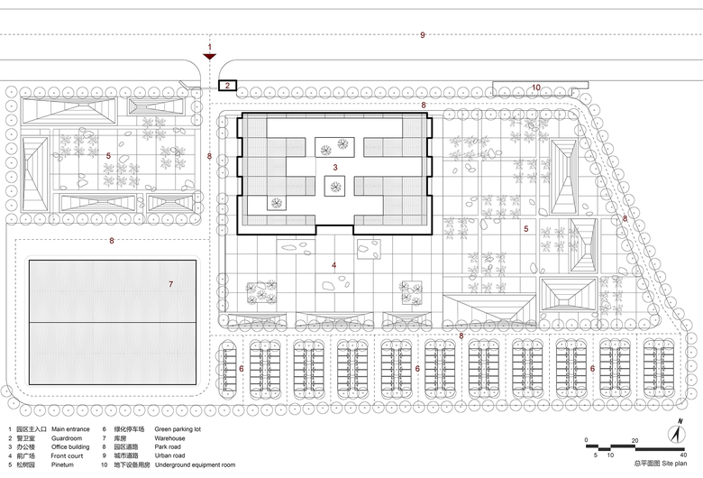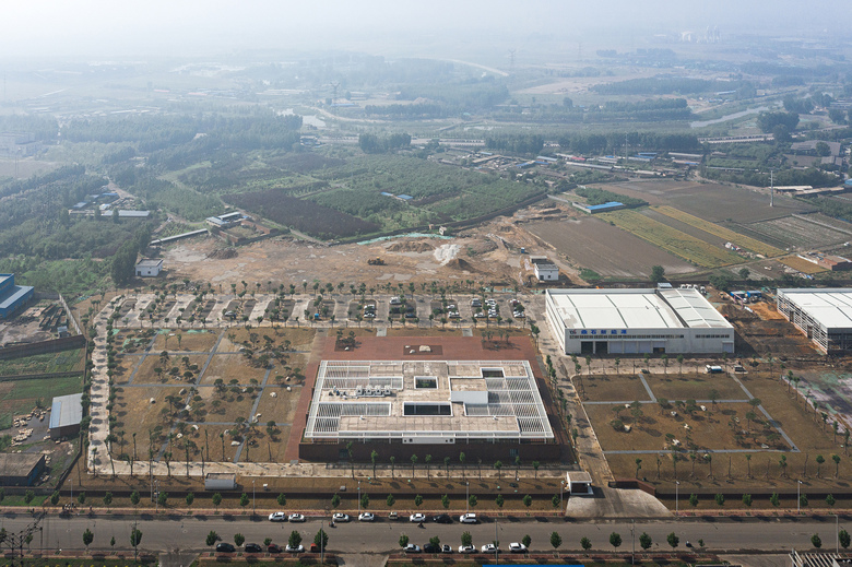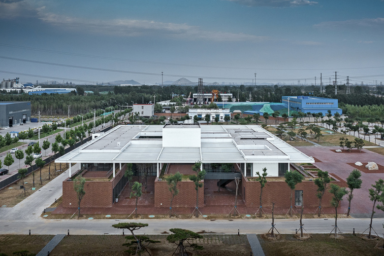 The project is an office building of a logistics company, located in an industrial park on the outskirts of a city in Northern China. The industrial park occupies a plain and expansive land area, which is adjacent to an urban road on the north and next to an unexploited urban land on the south. The office building was planned to sit at the middle of the industrial park, with pine trees, lawns and footpaths forming gardens on its north and west sides, while on the south side is a wide front court and a parking lot.