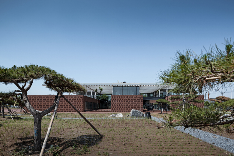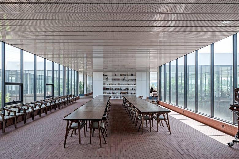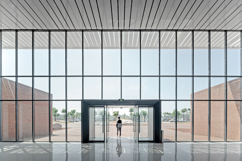The entire architecture is covered by a 4,000-square-meter flat roof and sun-shading grilles formed by aluminum strips. The grilles draw on the linear forms of surrounding farmland, and soften floor slabs. From the building's middle area to east and west sides, the interspace between aluminum strips gradually decreases. Besides, each aluminum strip features width variations and perforated surfaces. The steel-structured rooftop of the three architectural blocks and the sun-shading grilles together constitute an integrated large roof. It looks like a lampshade with interspaces, which allows light to filter down, and thereby turning the building and courtyard beneath into a "forest" of light and shadows. The varying light brings changes to spaces throughout the day. The rhythmic interplay of light and shadows, as well as human activities, together produce distinctive vivid scenes.